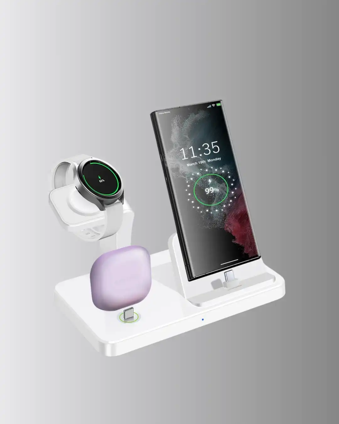 Apple cihazlarınız için tek bir şarj çözümü!4’ü 1 arada Kablosuz Şarj Standı, iPhone, Apple Watch ve AirPods cihazlarını aynı anda güvenle şarj eder.iPhone 8 – iPhone 13 Pro Max dahil olmak üzere kablosuz şarjı destekleyen tüm modellerle uyumludur.Ayrıca, Apple Watch serileri (SE–1) ve AirPods 1, 2, 3, Pro modelleriyle tam entegre çalışır.Klasik kablo dağınıklığını ortadan kaldıran bu tasarım, tek priz üzerinden dört cihazı besler.Her cihaza özel yerleştirme noktası, cihazların karışmasını önler.Kaymaz taban ve stabil şarj yüzeyi, cihazlarınızın güvenle sabitlenmesini sağlar.Aşırı voltaj, kısa devre ve aşırı ısınmaya karşı koruma sağlayan akıllı şarj çipi, güvenli bir şarj deneyimi sunar.Modern tasarımı, masaüstü veya komodin üzerinde mükemmel bir görünüm yaratır.Hem işlevsel hem es bir şarj çözümü arayan Apple kullanıcıları için ideal!