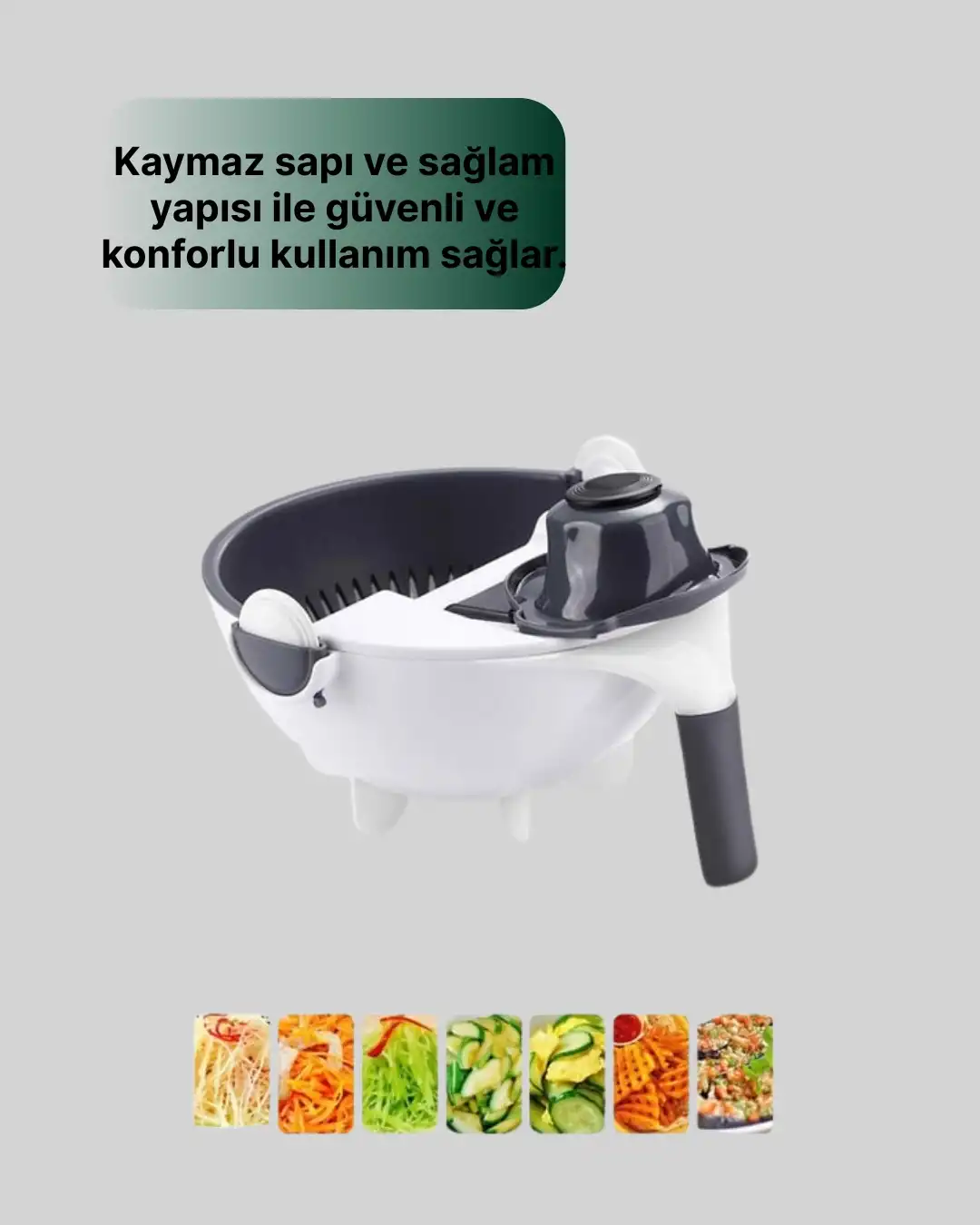 Mutfakta daha hızlı, düzenli ve güvenli çalışmak isteyenler için 5 Fonksiyonlu Döner Süzgeçli Rende, çok yönlü yapısıyla büyük kolaylık sağlar. Döner mekanizmalı sistemi sayesinde farklı bıçakları kolayca kullanabilir, sebze ve meyvelerinizi istediğiniz şekilde doğrayabilirsiniz. İnce ya da kalın rendeleme, şerit ya da yuvarlak dilimleme işlemlerini tek cihazla yapmak mümkündür. Hazne kısmı, rendeleme sırasında doğranan yiyecekleri toplar ve aynı zamanda süzgeç görevi görerek yıkama işlemini pratik hale getirir. Kaymaz taban ve ergonomik gövde, güvenli kullanım sunarken, el koruma atı olası kazaları önler. Kompakt yapısıyla mutfağınızda yer kaplamaz, kolay temizlenebilir tasarımıyla hijyen sağlar.