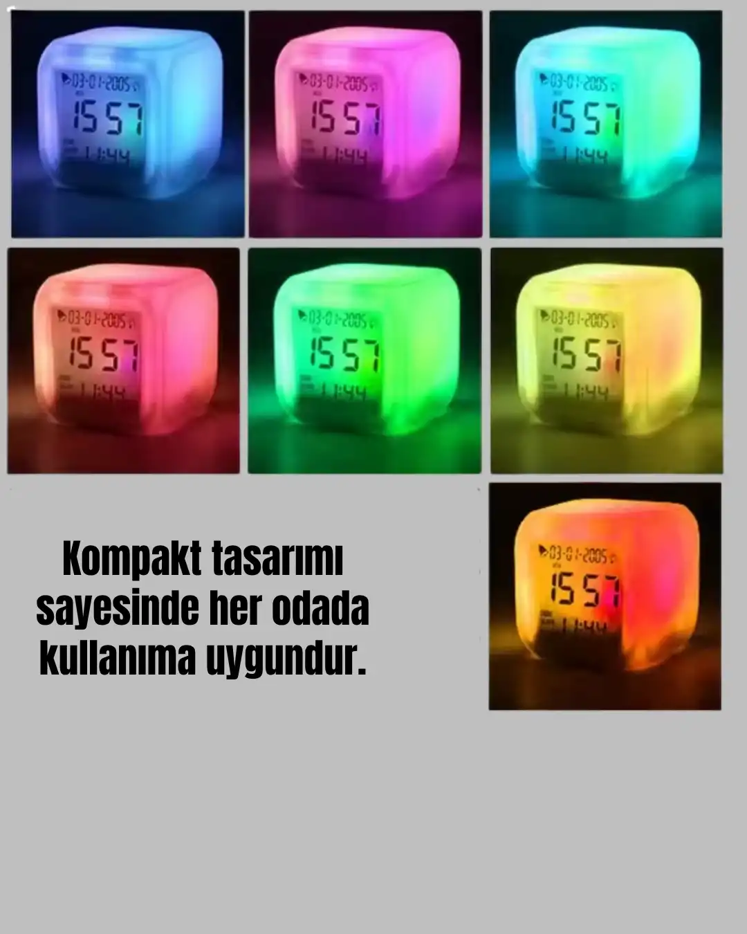 Bu renk değiştiren alarmlı dijital küp saat, çok yönlü özellikleri ve modern tasarımıyla dikkat çeker. 7 renk LED ışık modu, odanıza görsel bir şıklık kazandırırken, gece lambası olarak da kullanılabilir.Saatin işlevleri arasında alarm, müzikli uyarı, termometre, kronometre, takvim ve doğum günü hatırlatıcı bulunur. Özellikle müzikli alarm fonksiyonu klasik alarmlara kıyasla daha konforlu bir uyanış sağlar.8x8x8 cm ölçülerindeki kompakt tasarım, ürünü taşınabilir hale getirir. Yatak odasında, ofiste, çocuk odasında ya da seyahatlerde rahatlıkla kullanılabilir.Gece kullanımında oldukça işlevseldir. Saate dokunduğunuzda gövde ve ekran birlikte aydınlanır, 7 farklı renk arasında geçiş yapar. Dilerseniz sürekli renk değiştirme modunu da tercih edebilirsiniz.4 adet AAA ince kalem pil ile çalışır (piller dahil değildir). Pil ile çalışması, kablosuz kullanım kolaylığı sağlar.Modern kutu tasarımı sayesinde yalnızca işlevsel bir ürün değil, aynı zamanda sevdiklerinize sunabileceğiniz güzel bir hediye seçeneğidir.