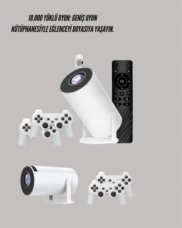 Gelişmiş teknolojiyle donatılmış bu kablosuz akıllı projeksiyon cihazı, hem günlük kullanım hem de profesyonel sunum ve eğlence ihtiyaçları için ideal bir çözümdür. 4K ultra HD çözünürlüğü, güçlü bağlantı seçenekleri, zengin uygulama desteği ve taşınabilir yapısıyla sinema keyfini, oyun deneyimini ve sunum verimliliğini bir araya getirir.Ürün Özellikleri & Açıklamaları1. 4K Ultra HD Çözünürlük Desteği 3840x2160 çözünürlük desteği ile sinema kalitesinde net ve keskin görüntüler sunar. Film, dizi, oyun veya sunumlarda renkler daha canlı, detaylar daha derindir. Büyük ekranlarda görüntü kaybı olmadan kaliteli görsel deneyim sağlar.2. Kablosuz Bağlantı Özellikleri (Wi-Fi 6 & Bluetooth 5.0) Wi-Fi 6 teknolojisi, hızlı ve kesintisiz internet bağlantısı sağlar. Yüksek çözünürlüklü içerikler takılmadan oynatılır. Bluetooth 5.0 desteği sayesinde kulaklık, hoparlör, oyun kumandası gibi cihazlarla kablosuz bağlantı kurabilirsiniz. Kablo karmaşasını ortadan kaldırır, hareket özgürlüğü sunar.3. Çoklu Bağlantı Seçenekleri HDMI Girişi: Bilgisayar, oyun konsolu, medya oynatıcı gibi cihazlarla uyumludur. USB Girişi (2 adet): Harici disk, USB bellek, mouse veya klavye bağlantısı yapılabilir. AUX Girişi: Harici ses sistemlerine bağlanabilir. RJ45 Ethernet Portu: İsteğe bağlı olarak kablolu ağ bağlantısı sağlar. Type-C PD Girişi: Cihaz kullanılırken şarj edilebilir.4. 10.000+ Oyun ve 4.000+ Uygulama Desteği Android tabanlı işletim sistemi sayesinde cihaz üzerinden Google Play gibi mağazalardan doğrudan uygulama ve oyun indirilebilir. Netflix, YouTube, Amazon Prime, Zoom, Spotify, Office uygulamaları gibi popüler uygulamalar desteklenir. Ayrıca 10.000'den fazla mobil oyun desteği ile eğlenceli bir oyun deneyimi sunar.5. Ekran Yansıtma (Screen Mirroring / Miracast / AirPlay) Akıllı telefon, tablet ya da bilgisayar ekranınızı cihazın ekranına anında yansıtabilirsiniz. Video, fotoğraf, sunum, dosya gibi içerikler büyük ekranda rahatlıkla paylaşılır. Android ve iOS cihazlarla tam uyumludur.6. Ayarlanabilir Çift Kollu Tasarım Cihazın çift kollu destek sistemi sayesinde farklı açılarda kolayca konumlandırılabilir. Tavan, masa veya tripod üzerinde sabit kullanım için uygundur. Kolay kurulum ve sağlam yapı, her ortamda güvenli kullanım sunar.7. Kompakt ve Taşınabilir Tasarım Cihaz sadece 1.2 kg ağırlığında olup kolayca taşınabilir. Kompakt ölçüleri sayesinde çantanızda, valizinizde ya da araçta yer kaplamadan taşınabilir. Ev, ofis, kamp, okul gibi birçok ortamda pratik kullanım sağlar.Teknik Özellikler (Detaylı) ÖzellikAçıklamaÇözünürlük Desteği4K Ultra HD (3840x2160)Kablosuz BağlantıWi-Fi 6, Bluetooth 5.0HDMI Girişi1 adetUSB Girişi2 adet USB 3.0AUX Girişi1 adet 3.5mm jackEthernet GirişiRJ45 LAN PortuType-C Şarj DesteğiVar (PD destekli)Ekran YansıtmaMiracast, AirPlay, DLNAİşletim SistemiAndroid tabanlıUygulama Desteği4.000+ uygulamaOyun Desteği10.000+ mobil oyunProjeksiyon Mesafesi1.5 – 5 metre arasıGörüntü Boyutu30 – 200 inç arasıHoparlörDahili stereoSoğutma SistemiSessiz fan teknolojisiAğırlıkYaklaşık 1.2 kgBoyutlar22 x 16 x 9 cm