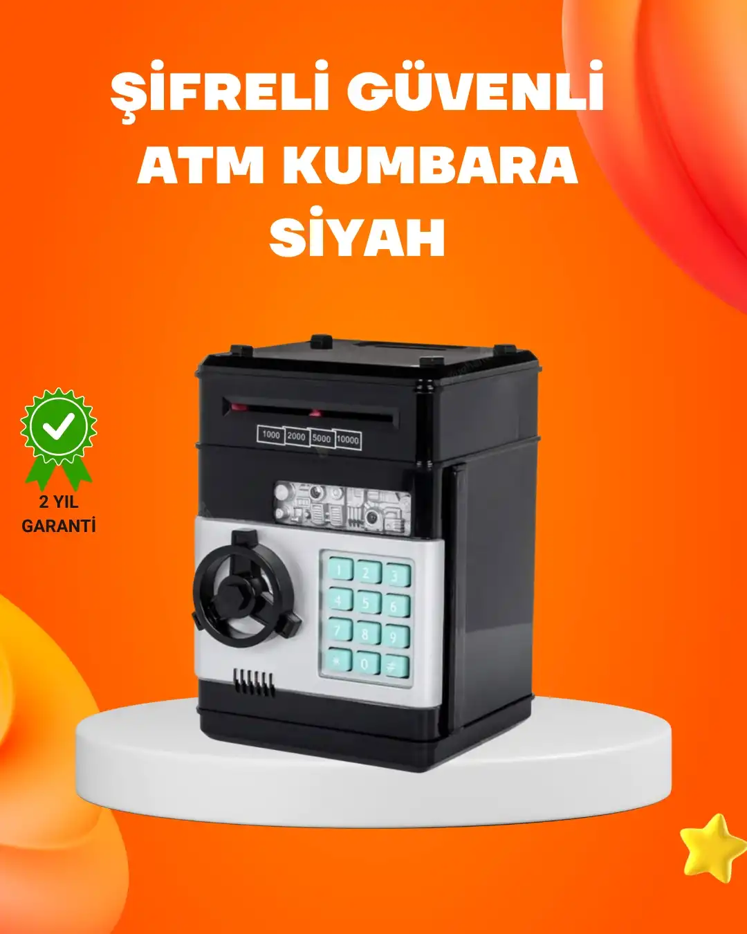 Bu otomatik çeken şifreli ATM tasarımlı kumbara, güvenli saklama ve eğlenceli kullanım özelliklerini bir araya getirir. Gerçek ATM görünümüne sahip olan ürün, hem çocuklar hem de yetişkinler için tasarlanmıştır. Portatif kasa yapısı sayesinde istenilen her yerde rahatlıkla kullanılabilir.Kâğıt lar otomatik olarak hazneye çekilirken, bozuk lar üst bölümden atılabilir. Bu mekanizma, kullanıcıya gerçek bir bankamatik deneyimi yaşatır. Geniş haznesi sayesinde uzun süre dolmadan kullanılabilir ve sadece lar değil, küçük değerli eşyalar da güvenle saklanabilir.Şifreli güvenlik sistemi, ürünün en önemli özelliklerinden biridir. 4 haneli şifre yalnızca doğru girildiğinde kapak açılır. Varsayılan şifre değiştirilebilir yapıdadır. Işıklı ve sesli uyarılar, her işlemde devreye girerek eğlenceli bir kullanım sunar.Çocuklar için biriktirme alışkanlığını kazandıran eğitici bir ürün olmasının yanı sıra, yetişkinler için masa üstü mini kasa olarak da kullanılabilir. Dayanıklı ABS plastikten üretilmiştir ve uzun ömürlüdür. Dekoratif görünümü ile ev ve iş yerlerine uyum sağlar.