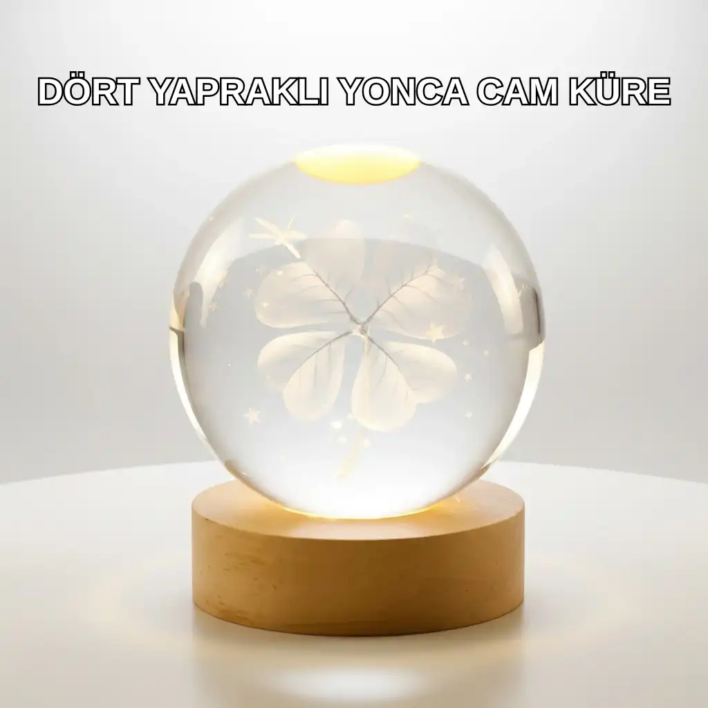 • Yonca Figürlü Cam Küre USB Işıklı Ahşap Tabanlı Dekoratif Masa Lambası