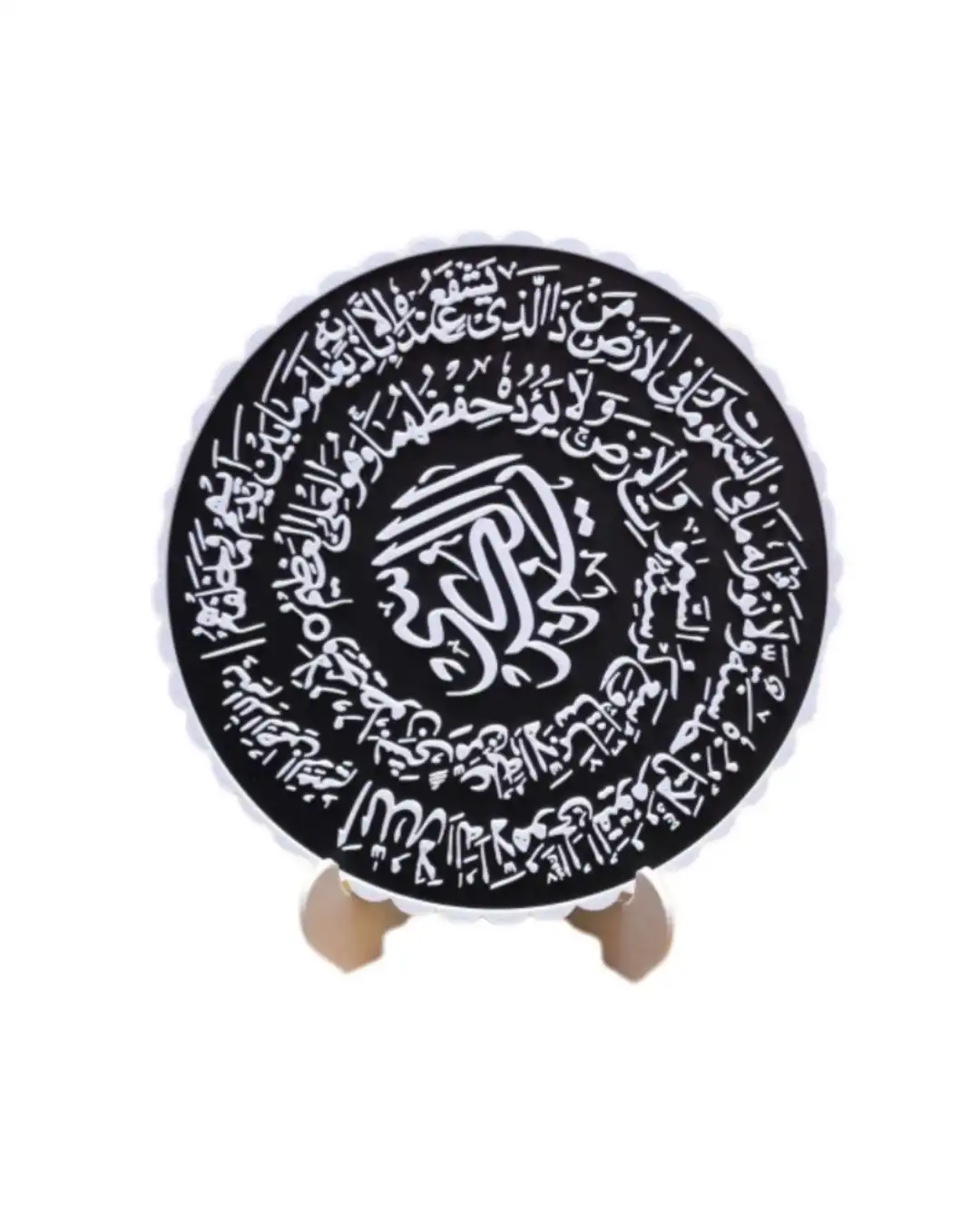 Bu Ayetel Kürsi dekoratif pano, modern tasarım ile geleneksel hat sanatını bir araya getirir. Siyah zemin üzerine beyaz yazı kontrastı sayesinde dikkat çekici bir görünüm oluşturur. Bulunduğu ortama hem huzur hem de es bir şıklık kazandırır.Yuvarlak formu, klasik dikdörtgen tabloların dışında özgün bir tasarım sunar. Çevresini saran detaylı yazı işçiliği, merkezdeki güçlü kompozisyon ile dengeli bir bütünlük oluşturur. Yazı karakterinin netliği ve tasarımın simetrik yapısı, ürünü dekoratif açıdan oldukça güçlü hale getirir.Ev dekorasyonunda salon, antre, çalışma odası veya kitaplık üstünde rahatlıkla konumlandırılabilir. Standlı yapısı sayesinde ekstra montaj gerektirmez. Sade ama etkileyici bir dini dekor ürünü arayanlar için ideal bir tercihtir.Özel günlerde, yeni ev hediyesi olarak veya anlamlı bir hatıra olarak sunulabilecek zarif bir üründür.