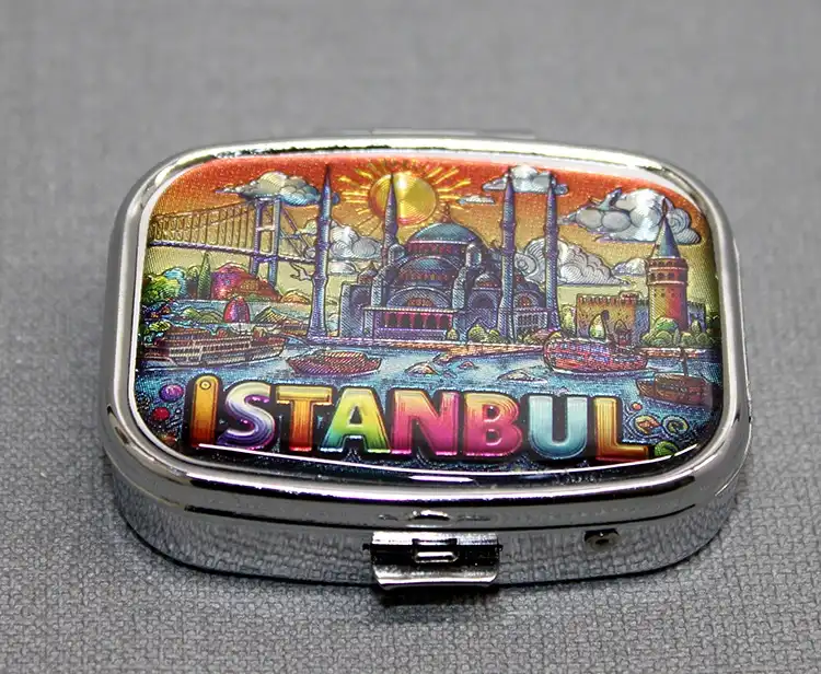 İSTANBUL TEMALI İLAÇ KUTUSU - MODEL 12 Ürün Özellikleriİstanbul Temalı İlaç Kutusu - Model 12, kompakt ölçüsü ve şık tasarımı ile günlük kullanım için pratik bir saklama çözümüdür. 5.5x4.5 cm boyutundaki küçük ve taşınabilir formu sayesinde çanta, cep ve seyahat çantasında rahatlıkla taşınabilir. Üzerinde yer alan İstanbul temalı tasarım detayı ürüne estetik ve dikkat çekici bir görünüm kazandırır. İç kısmında bulunan iki bölmeli ilaç kutusu yapısı sayesinde tablet ve kapsüllerinizi düzenli şekilde ayırarak muhafaza etmenize yardımcı olur. Dayanıklı gövde yapısı ile uzun süreli kullanım sunan bu taşınabilir ilaç saklama kutusu, hem işlevsel hem de dekoratif bir aksesuardır.Ürün Teknik Özellikleri Özellik Açıklama Ürün Adı İstanbul Temalı İlaç Kutusu - Model 12 Model Model 12 Ölçü 5.5 x 4.5 cm Bölme 2 bölmeli Kullanım Alanı Tablet ve kapsül saklama Paket İçeriği1 adet İstanbul Temalı İlaç Kutusu - Model 12