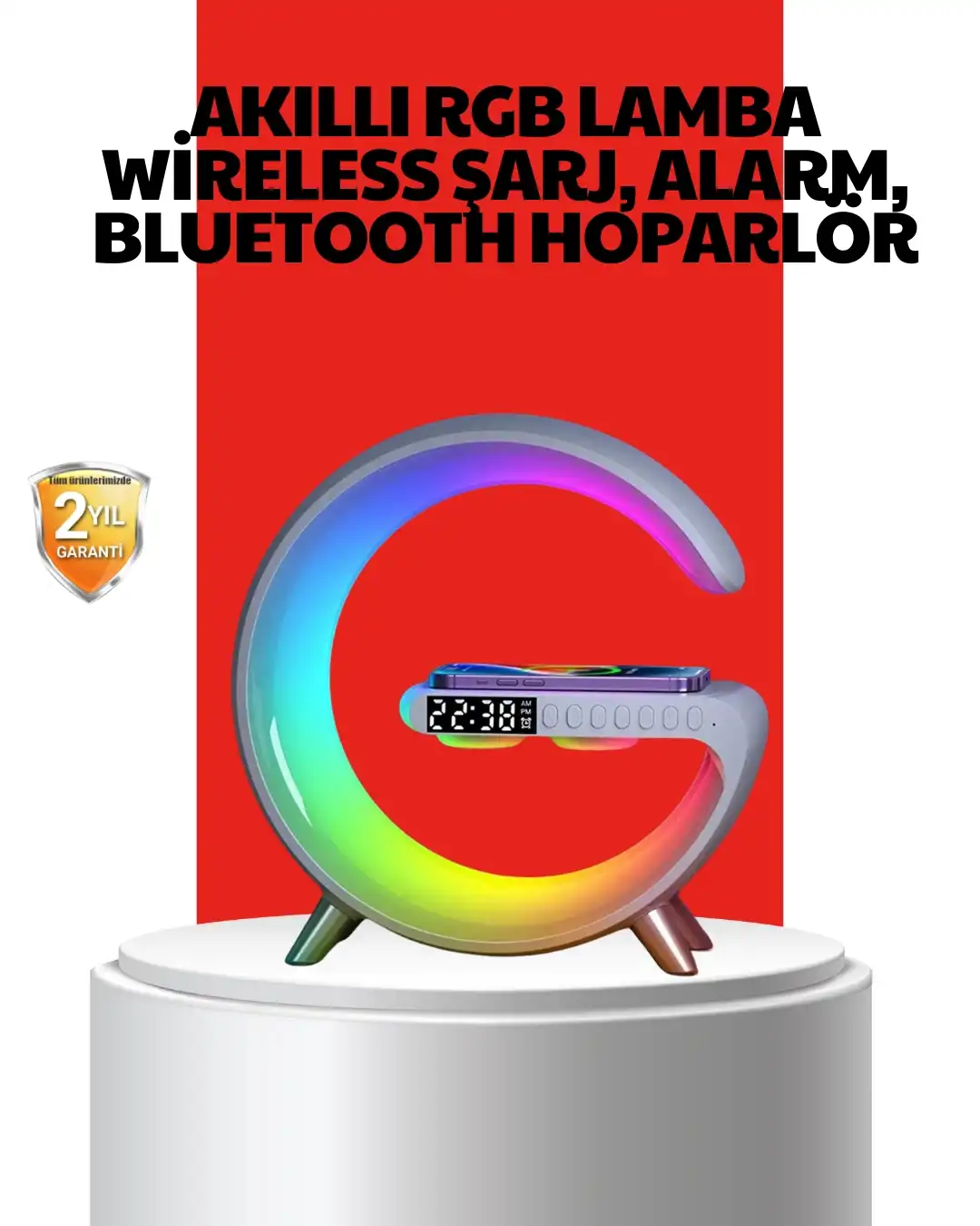 Bu çok fonksiyonlu akıllı atmosfer lambası, modern yaşam alanları için hem dekoratif hem de son derece kullanışlı bir üründür. 15W kablosuz hızlı şarj özelliği sayesinde telefonunuzu kısa sürede ve kablo karmaşası olmadan şarj edebilirsiniz. Yatak odası, başucu, çalışma masası, oturma odası ve ofis gibi alanlarda günlük kullanım için idealdir.Ürün; kablosuz şarj cihazı, Bluetooth hoparlör, masa lambası, uyku lambası, alarm saati ve saat özelliklerini tek bir gövdede birleştirir. Bluetooth bağlantı sayesinde müzik dinleyebilir, kitap okurken ya da dinlenirken yumuşak ışık eşliğinde keyifli bir ortam oluşturabilirsiniz.