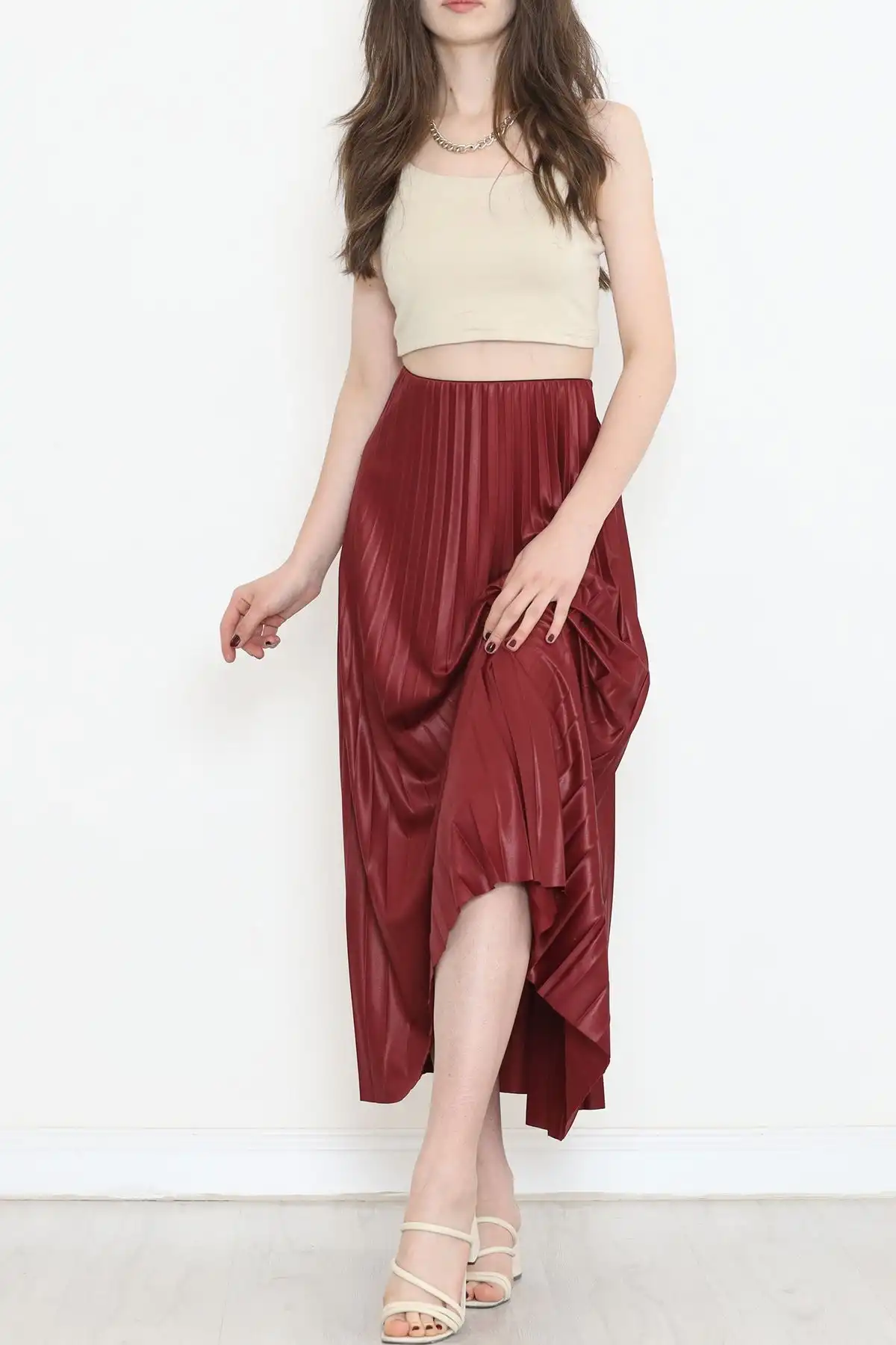 -Pileli detaylar, eteğe hareket ve hacim katarken aynı zamanda feminen bir dokunuş sağlar. Bu detaylar, eteğin tarzını ve çekiciliğini artırır, böylece her kombinde dikkat çekici bir seçenek haline gelir. Bordo rengi, sıcaklık ve zarafeti bir araya getirerek her mevsimde kullanılabilen bir renktir.