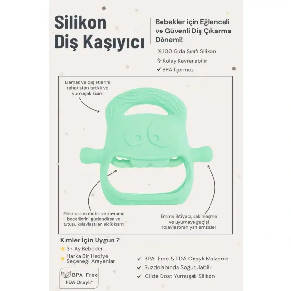 ChatGPT:AÇIK YEŞİL BEBEK SİLİKON DİŞ KAŞIYICIÜrün ÖzellikleriAçık yeşil silikon bebek diş kaşıyıcı, bebeklerin diş çıkarma sürecini güvenli ve konforlu hale getirir. Sevimli ve modern tasarımı, farklı dokulara sahip yüzeyleri ve ergonomik tutma alanları sayesinde minik eller için kolay kavrama sağlar. Hassas diş etlerine nazikçe masaj yak bebeklere huzurlu bir rahatlama sunar.Çift yönlü emzik kolları, doğal emme refleksini desteklerken parmak emme alışkanlığını azaltmaya yardımcı olur. Aynı zamanda çene kaslarını çalıştırarak ağız ve çene gelişimini teşvik eder. Hafif ve esnek yapısı, bebeklerin kendi başına kolayca tutabilmesini sağlar.Diş kaşıyıcı yalnızca rahatlatıcı bir ürün değil, aynı zamanda motor ve duyusal gelişimi destekleyen bir oyun arkadaşıdır. Çeşitli tutma bölgeleri bebeğin kavrama becerilerini artırırken, yumuşak silikon yüzeyi dokunsal keşfi destekler. %100 gıda sınıfı silikon malzemeden üretilmiş olup BPA, BPS ve zararlı kimyasallar içermez. Yenidoğan döneminden itibaren güvenle kullanılabilir.Paket İçeriği1 adet Açık Yeşil Bebek Silikon Diş Kaşıyıcı 1 adetChatGPT:AÇIK YEŞİL BEBEK SİLİKON DİŞ KAŞIYICIÜrün ÖzellikleriAçık yeşil silikon bebek diş kaşıyıcı, bebeklerin diş çıkarma sürecini güvenli ve konforlu hale getirir. Sevimli ve modern tasarımı, farklı dokulara sahip yüzeyleri ve ergonomik tutma alanları sayesinde minik eller için kolay kavrama sağlar. Hassas diş etlerine nazikçe masaj yak bebeklere huzurlu bir rahatlama sunar.Çift yönlü emzik kolları, doğal emme refleksini desteklerken parmak emme alışkanlığını azaltmaya yardımcı olur. Aynı zamanda çene kaslarını çalıştırarak ağız ve çene gelişimini teşvik eder. Hafif ve esnek yapısı, bebeklerin kendi başına kolayca tutabilmesini sağlar.Diş kaşıyıcı yalnızca rahatlatıcı bir ürün değil, aynı zamanda motor ve duyusal gelişimi destekleyen bir oyun arkadaşıdır. Çeşitli tutma bölgeleri bebeğin kavrama becerilerini artırırken, yumuşak silikon yüzeyi dokunsal keşfi destekler. %100 gıda sınıfı silikon malzemeden üretilmiş olup BPA, BPS ve zararlı kimyasallar içermez. Yenidoğan döneminden itibaren güvenle kullanılabilir.Paket İçeriği1 adet