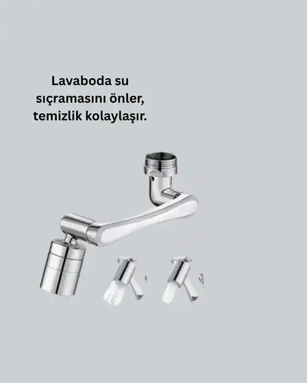 Bu esnek 1080° musluk başlığı, üç eklemli robotik tasarımıyla suyu dilediğiniz açıya yönlendirerek günlük işlemleri çok daha kolay hale getirir. Hareketli yapısı sayesinde klasik musluklara göre çok daha geniş bir kullanım alanı sunar. Lavabonun ulaşılması zor bölgelerine erişmek artık zahmetsizdir.Başlık, iki işlevsel su modu içerir: Köpük Akışı, yumuşak ve geniş bir akış sunarak hassas kullanım gerektiren işlemler için idealdir. Güçlü Sprey Akışı ise yüksek basınçlı temizleme gücüyle kirleri ve yağ kalıntılarını rahatlıkla temizler. Günlük kullanım sırasında ihtiyaç duyduğunuz moda tek hareketle geçebilirsiniz.Su tasarrufu destekleyen iç yapısı, gereksiz harcamayı azaltır ve akışı optimize eder. Böylece temizlik performansından ödün vermeden daha verimli su kullanımı sağlar.Ürün, sebze–meyve durulama, tencere-bardak temizliği, lavabo köşelerine erişim, yüz yıkama ve el temizliği gibi pek çok işlemde üstün konfor sunar. Çocuklu aileler, yaşlı kullanıcılar ve yoğun mutfak trafiği olan evler için oldukça avantajlıdır.Takması son derece kolaydır. Standart musluklarla uyumludur ve adaptörleri sayesinde farklı sistemlere de dakikalar içinde bağlanabilir.Es ve modern görünümüyle hem mutfak hem banyo lavabolarına şıklık ve fonksiyonellik kazandırır.