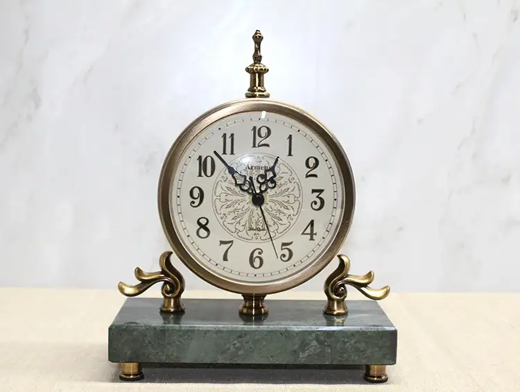 MERMER TABANLI MASAÜSTÜ SAAT Ürün ÖzellikleriMermer tabanlı masa üstü saat, klasik ve zarif tasarımıyla bulunduğu ortama şıklık katar. Yeşil mermer taban üzerine yerleştirilmiş metal gövdesi ve detaylı işlemeleriyle dekoratif bir görünüm sunar. 43x21 cm ölçüleriyle hem masa hem de raf üzerinde dikkat çekici bir aksesuar olarak kullanılabilir. Sağlam yapısı sayesinde uzun ömürlüdür ve klasik dekorasyonlarla uyum sağlayarak bulunduğu ortama nostaljik bir hava katar. Evinizde veya ofisinizde masa üstü dekorunu tamamlayacak şık bir parçadır.Paket İçeriği1 adet Mermer Tabanlı Masaüstü Saat