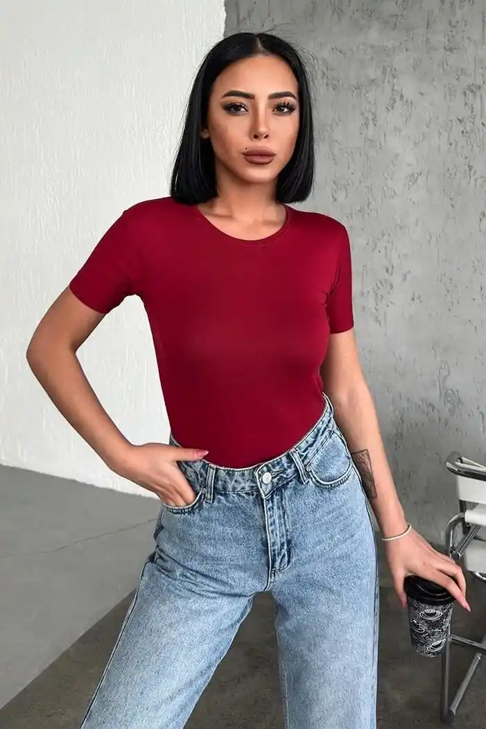 -Bu muhteşem kısa kollu bisiklet yaka likralı bordo viskon penye body, gardırobunuzun vazgeçilmez parçalarından biri olmaya aday! Rahatlığı ve şıklığı bir araya getiren bu body, her an tarzınızı yansıtmanıza ve kendinizi özgür hissetmenize yardımcı olacak.