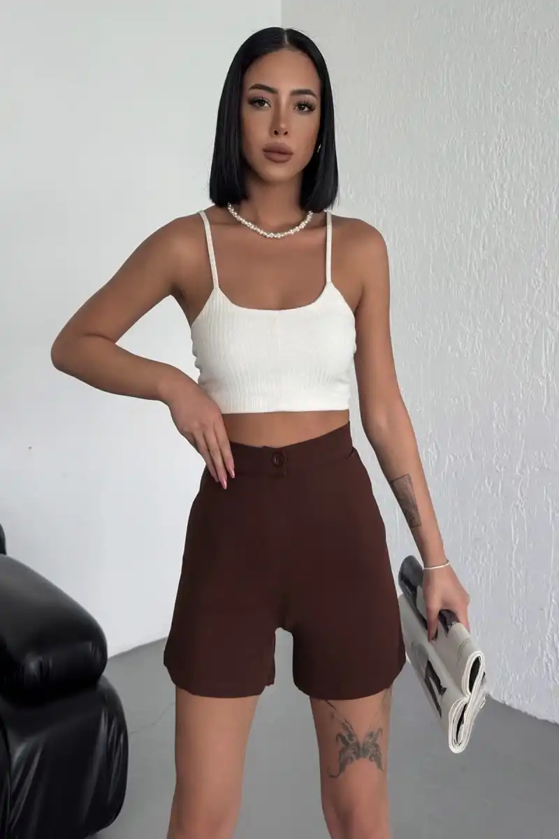 Tarz ve Rahatlığı Bir Arada Sunan Yüksek Bel Esnek Likralı Krep Şort Kahverengi