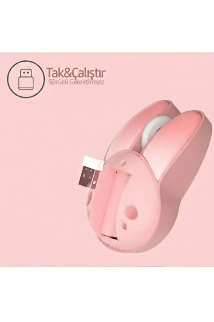 Tavşan Figürlü Kablosuz Mouse Pil Dahil Etiket Hediyeli Pembe