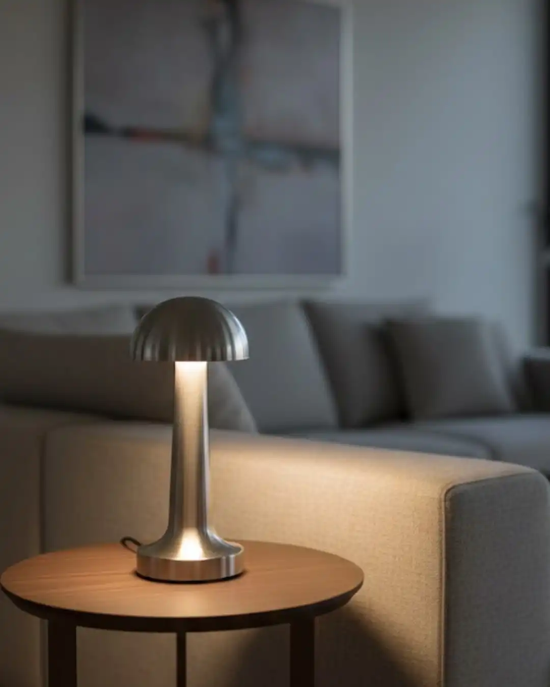 • Dokunmatik Mantar Masa Lambası 3 Modlu Işık Şarjlı Kablosuz LED Krom Gövde