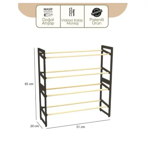 ChatGPT:4 KATLI AHŞAP AYAKKABILIKÜrün Özellikleri4 katlı ahşap ayakkabılık, şık ve modern tasarımıyla evinizin düzenini kolayca sağlamanıza yardımcı olur. 20x65x51 cm boyutundaki kompakt yapısı sayesinde az yer kaplar ve dar alanlarda bile rahatlıkla kullanılabilir. Hem ayakkabılık hem de çok amaçlı raf olarak değerlendirilebilen bu ürün, portatif yapısıyla kolay taşınabilir. Vidasız pratik montaj özelliği sayesinde ekstra bir alete gerek kalmadan hızlıca kurulabilir. Hem dört raflı olarak hem de ayrı ayrı 2 katlı iki ayakkabılık olarak kullanma avantajı sunar.Ahşap rafları ve sağlam metal yan profilleri dayanıklı kullanım sunarken, dekoratif görünümüyle evinize estetik bir hava katar. Hem giriş alanlarında hem de balkon, yatak odası veya kiler gibi farklı mekânlarda düzen sağlamak için idealdir.Paket İçeriği1 adet 4 Katlı Ahşap Ayakkabılık 1 adet 4 Katlı Ahşap Ayakkabılık