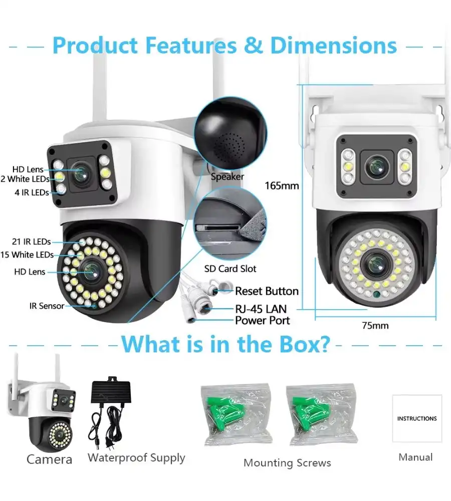 4MP (2MP + 2MP) çözünürlük sunan bu çift lensli IP kamera, yatay 255 derece ve dikey 90 derece dönebilme özelliği ile geniş bir izleme alanı sağlar. Maksimum 64G SD kart desteği ile (kart dahil değildir) yerel depolama imkanı sunar. Kompakt boyutu sayesinde kullanımı son derece rahattır.