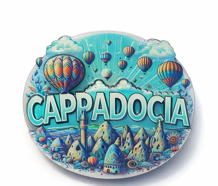 KAPADOKYA TEMALI AHŞAP BUZDOLABI MAGNETİ MODEL 6Ürün ÖzellikleriKapadokya Temalı Ahşap Buzdolabı Magneti Model 6, Kapadokya’nın eşsiz doğasını ve kültürel atmosferini yansıtan özel bir tasarıma sahiptir. Peri bacaları, sıcak hava balonları ve bölgeye özgü manzara detayları, yüksek çözünürlüklü baskı tekniği ile ahşap yüzey üzerine özenle uygulanmıştır. 8x8 cm ölçüsü sayesinde kompakt bir kullanım sunar; buzdolabı, metal pano, ofis dolabı gibi manyetik yüzeylerde hem şık hem de dengeli bir görünüm oluşturur. Doğal ahşap malzemeden üretilmiş olması ürüne sıcak ve otantik bir hava kazandırırken, aynı zamanda dayanıklı yapısı ile uzun süreli kullanım imkânı sağlar. Canlı renkleri solmaya karşı dirençlidir ve günlük kullanımda estetik görünümünü korur. Arka kısmında yer alan güçlü mıknatıs, yüzeye sağlam şekilde tutunarak düşme veya kayma riskini azaltır. Kapadokya’yı ziyaret edenler için anlamlı bir hatıra, sevdiklerine yöresel ve dekoratif bir hediye arayanlar için ise zarif ve kalıcı bir seçenek sunar. Ev ve ofis dekorasyonuna kültürel bir dokunuş katmak isteyenler için idealdir.Paket İçeriği1 adet Kapadokya Temalı Ahşap Buzdolabı Magneti Model 6