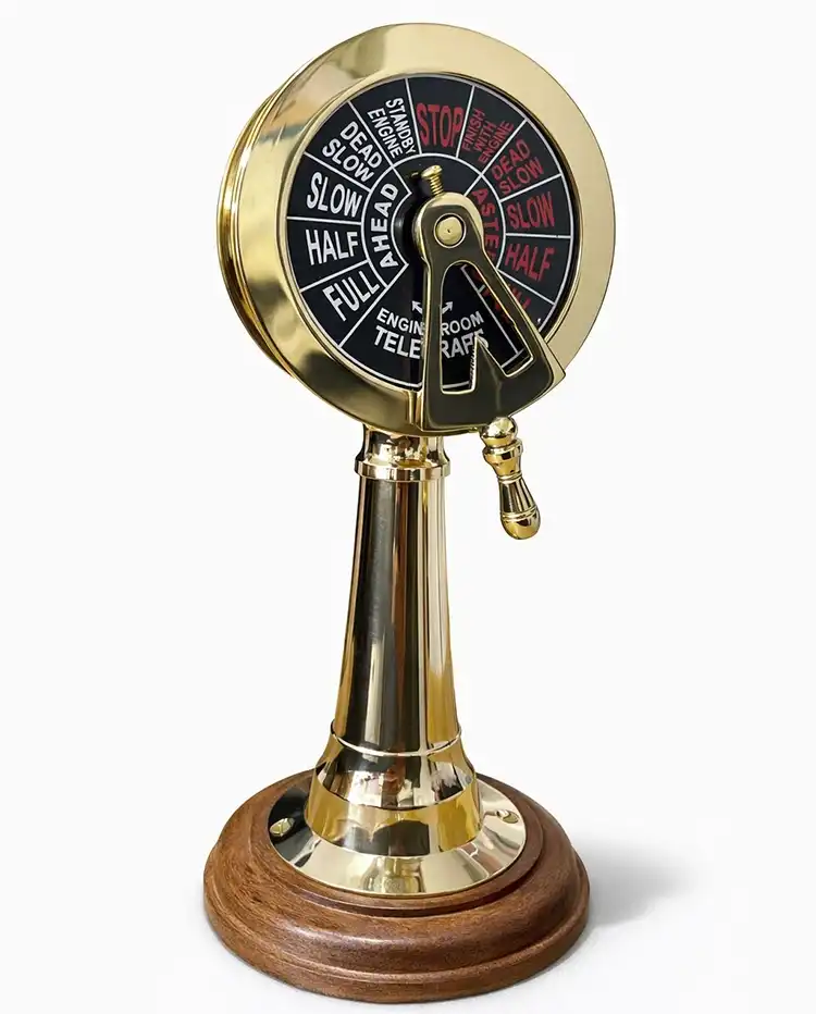 PİRİNÇ MAKİNA TELGRAFIÜrün ÖzellikleriPirinç Makina Telgrafı, denizcilik tarihinin en ikonik iletişim araçlarından birini ev ve ofis dekorasyonunuza taşıyan, el işçiliği detaylarıyla zenginleştirilmiş prestijli bir aksesuardır. 23x9 cm boyutlarındaki bu özel tasarım, gemi kaptan köşkünden makine dairesine komut göndermek için kullanılan orijinal telgrafların estetik bir minyatür formudur. Pirinç görünümlü kaliteli malzeme kullanılarak üretilen gövdesi, antik gold ışıltısıyla bulunduğu ortama nostaljik ve asil bir hava katar. Ürünün altında yer alan dairesel ahşap stand, parlak metalik yüzey ile doğal dokunun kusursuz uyumunu sunarken ürünün dengeli ve şık bir şekilde sergilenmesini sağlar. Kadran üzerindeki net komut yazıları ve hareketli kol mekanizması, ürünün otantik karakterini güçlendirerek gerçekçi bir deneyim sunar. Bu dekoratif makine telgrafı, marin temalı mekanlar, çalışma odaları veya kütüphaneler için eşsiz bir tamamlayıcıdır. Hem deniz tutkunları hem de antika meraklıları için unutulmaz bir hediyelik eşya seçeneği olan bu biblo, geleneksel denizcilik estetiğini kaliteli işçilikle birleştirir. Bulunduğu her ortamda dikkat çekici bir odak noktası oluşturan bu pirinç dekor objesi, kaliteden ödün vermeyenler için tasarlanmıştır.Ürün Teknik ÖzellikleriÖzellikAçıklamaÜrün AdıPirinç Makina TelgrafıBoyut23x9 cmMalzemePirinç Görünümlü Kaliteli Metal ve Ahşap KaideTasarımGeleneksel Gemi Makine Telgrafı FormuRenkParlak Pirinç / Antik Gold ve KahverengiStilMarin / Vintage / Klasik DekorasyonKullanım AlanıOfis, Çalışma Odası, Vitrin, KoleksiyonPaket İçeriği1 Adet Pirinç Makina Telgrafı
