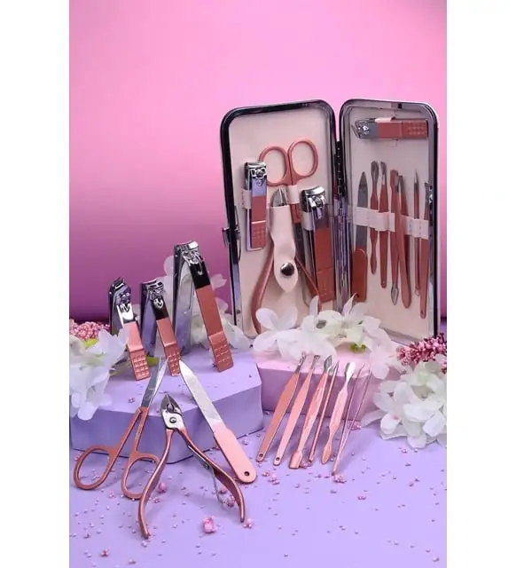 12 Parça Tam Donanımlı Set: Tırnak makası, et pensi, törpü, cımbız, kütikül itici ve diğer bakım aparatları.