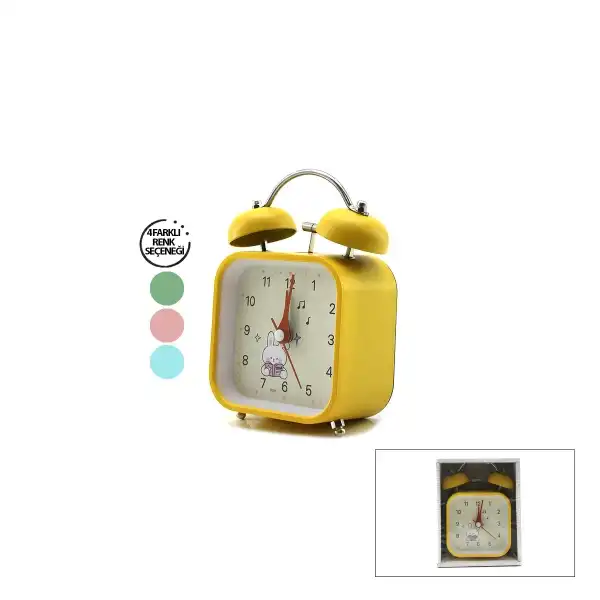 RENKLİ KARE MASA ÇALAR SAATİÜrün ÖzellikleriRenkli Kare Masa Çalar Saati, retro nostaljisini modern ve canlı renklerle birleştirerek sabahlarınıza neşe katıyor. Kompakt 8 cm boyutuyla komodin, çalışma masası veya raf üzerinde fazla yer kaplamadan şık bir duruş sergiler. Dayanıklı renkli plastik kasası ve klasik ikiz çan tasarımıyla hem dekoratif bir obje hem de güvenilir bir uyandırıcıdır. Saatin kadranında yer alan sevimli figürler çocuk odaları için mükemmel bir tercih oluştururken, canlı renkleri her yaştan kullanıcıya hitap eder. Gece saat takibini kolaylaştıran entegre ışıklı kadran özelliği ve kolay ayarlanan alarm mekanizmasıyla son derece pratiktir. Pil ile çalışan yapısı sayesinde kablo karmaşasına son verir ve elektrik kesintilerinden etkilenmez. Bu dekoratif masa saati, hem zamanı yönetmenize yardımcı olur hem de bulunduğu ortama dinamik bir hava katar. Hafif ve taşınabilir olması sebebiyle seyahatlerinizde de yanınızda taşıyabileceğiniz bu çalar saat, sevdikleriniz için de hem kullanışlı hem de sempatik bir hediyelik eşya seçeneğidir.Ürün Teknik ÖzellikleriÖzellikAçıklamaÜrün AdıRenkli Kare Masa Çalar SaatiBoyut8 cmMalzemeYüksek Kaliteli Renkli Plastik KasaFonksiyonÇalar Saat (Alarm) ve Işıklı KadranGüç KaynağıPilli (Standart kalem pil ile çalışır)Renk SeçeneğiGörseldeki renklerden biri gönderilir, renk seçimi yapılamazKullanım AlanıYatak Odası, Çocuk Odası, Ofis, Çalışma MasasıPaket İçeriği1 Adet Renkli Kare Masa Çalar Saati