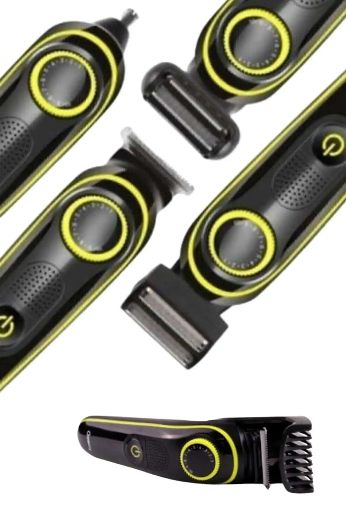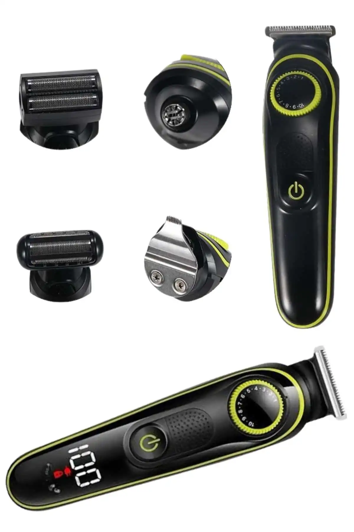 Bu 5'i 1 arada çok fonksiyonlu bakım seti, kişisel bakım rutininizi daha pratik ve etkili hale getiriyor. Saç kesimi, sakal tıraşı, burun ve kulak kılı temizliği, detaylı şekillendirme ve vücut tıraşı gibi birden fazla işlevi tek cihazda sunarak, tam kapsamlı bakım imkanı sağlıyor. Güçlü motoru ve paslanmaz çelik bıçakları ile pürüzsüz bir tıraş deneyimi sunarken, uzun ömürlü ve keskin yapısı sayesinde her kullanımda yüksek performans elde edebilirsiniz. Kablosuz ve şarjlı kullanımı sayesinde hareket özgürlüğü tanır; tam dolu batarya ile uzun süreli kullanım imkanı sunar. Farklı kesim uzunlukları için ayarlanabilir tarak başlıkları mevcuttur; bu sayede kişisel stilinize uygun şekillendirmeyi zahmetsizce gerçekleştirebilirsiniz. Ergonomik tutuşa sahip şık ve modern tasarımı, hem kullanım kolaylığı sağlar hem de banyo alanınıza es bir katkı sunar. Üzerindeki LED gösterge, pil seviyesini anlık olarak takip etmenize olanak tanırken, düşük sesli çalışması ile her ortamda konforlu bir kullanım deneyimi yaşatır. Suya dayanıklı başlıkları ve çıkarılabilir bıçakları sayesinde temizlik işlemleri oldukça kolaydır; hijyenik kullanım için yalnızca düzenli olarak yıkamanız yeterlidir.