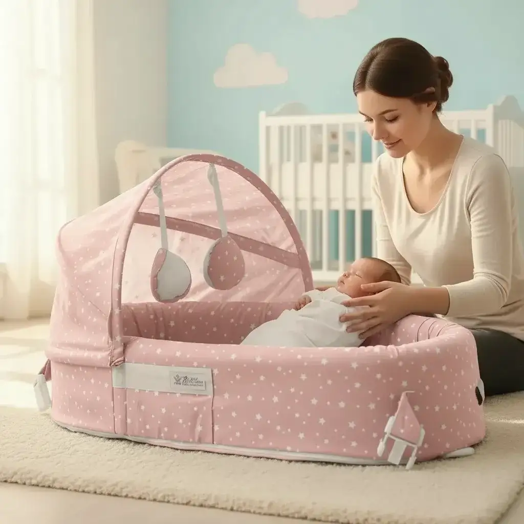 Taşınabilir Portatif Bebek Yatağı,Sırt Çantasına Dönüşebilen Portatif Bebek Beşiği (Pembe)