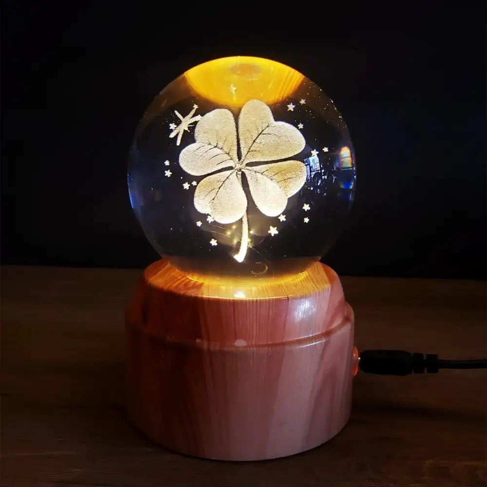 YONCA TASARIMLI USB DÖNEN CAM KÜREÜrün ÖzellikleriYonca tasarımlı USB dönen cam küre, zarif tasarımıyla dekoratif amaçlı kullanılabilecek şık bir objedir. 8 cm çapındaki kaliteli cam küresi, içerisindeki dört yapraklı yonca figürü ve yıldız desenleriyle gece karanlığında loş bir ambiyans sunar. Küre, ışıkla birlikte döner ve görsel olarak huzur veren bir atmosfer oluşturur. Alt kısmındaki 5 x 8.5 cm boyutundaki stand plastik malzemeden yapılmış olup ahşap görünümlüdür. USB bağlantısı ile çalışır ve prize veya güç kaynağına bağlanarak kullanılabilir. Özellikle hediye, masa dekorasyonu veya gece lambası olarak tercih edilebilir.Paket İçeriği1 Adet Yonca Tasarımlı USB Dönen Cam Küre