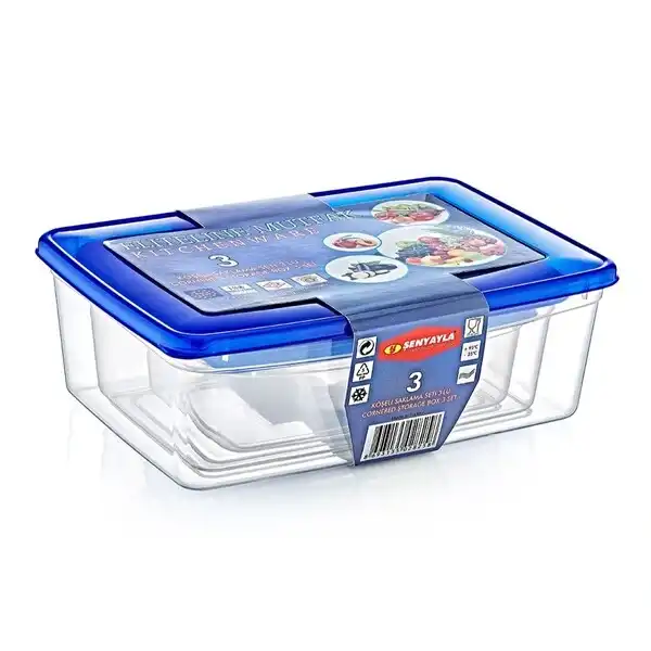 3'LÜ KÖŞELİ SAKLAMA KABI SETİÜrün ÖzellikleriMutfakta düzeni ve hijyeni ön planda tutanlar için ideal olan 3’lü Köşeli Saklama Kabı Seti, farklı boyutlardaki üç ayrı kutusuyla geniş bir kullanım alanı sunar. Set içerisinde 20x13,5x7 cm, 24x16,5x8,5 cm ve 27,5x19,5x9,5 cm boyutlarında üç adet saklama kabı bulunur.Her biri şeffaf gövdesi sayesinde içerisindekileri kolayca görmenizi sağlar. Sızdırmaz mavi kapakları, gıdaların tazeliğini uzun süre korur ve dolaplarda, buzdolabında ya da derin dondurucuda güvenle kullanılabilir. BPA içermeyen dayanıklı plastikten üretilmiştir, gıda ile temasa uygundur. Hafif ve sağlam yapısı sayesinde taşıması kolaydır.Bu set; yemek, salata, kahvaltılık, meyve veya atıştırmalıklarınızı muhafaza etmede mükemmel bir yardımcıdır. Aynı zamanda piknik ve seyahatlerde pratik bir çözüm sunar.Paket İçeriği1 adet 20x13,5x7 cm saklama kabı1 adet 24x16,5x8,5 cm saklama kabı1 adet 27,5x19,5x9,5 cm saklama kabı