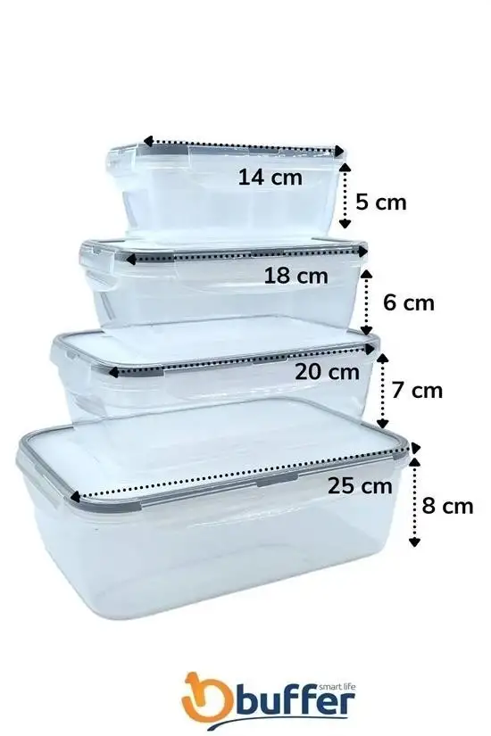 • 4'lü İç İçe Kilitli Kapaklı Plastik Erzak Saklama Kapları gıdalarınızı ilk günkü tazeliği ile muhafaza etmenizi sağlar Kapaksız olarak Buzluk ve Bulaşık Makinesinde kullanabilirsiniz