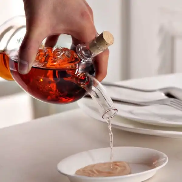CAM 2'Sİ 1 ARADA YAĞDANLIK VE SİRKELİKÜrün ÖzellikleriCam 2'si 1 Arada Yağdanlık ve Sirkelik, şişe içinde iki ayrı bölme sunar. Dış hazneye sirke, içteki üzüm kabartmalı hazneye ise zeytinyağı veya farklı sıvılar eklenebilir. İç kısmındaki üzüm formu, hem dekoratif bir şıklık sunar hem de ürünü benzersiz kılar.Ürün, yüksek kaliteli borosilikat camdan üretilmiştir, dayanıklı ve sağlıklıdır. Her iki ağız kısmı mantar tıpa ile kapatılarak sızdırmazlık sağlanır.400 ml hacminde olup, zeytinyağı, sirke, nar ekşisi, soslar ve benzeri sıvılar için uygundur.Bu cam şişe, özellikle sofralarda şıklığı artırmak isteyenler için mükemmel bir tercih olup, hem kullanım kolaylığı sağlar hem de estetik görüntüsüyle fark yaratır.Paket İçeriği1 Adet Cam 2'si 1 Arada Yağdanlık ve Sirkelik