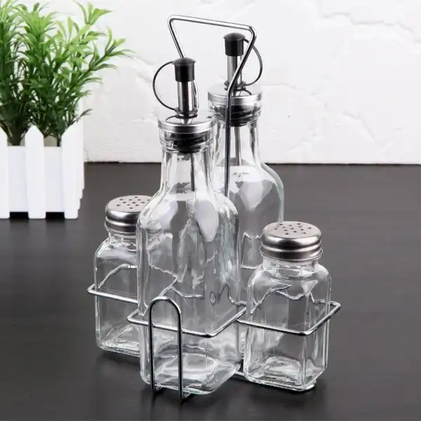 CAM YAĞLIK VE SİRKELİK SETİÜrün ÖzellikleriŞık ve kullanışlı tasarımıyla mutfakların vazgeçilmezi olan Cam Yağlık ve Sirkelik Seti, sofralarda ve yemek hazırlıklarında düzeni sağlamak için mükemmel bir seçimdir. Set içerisinde cam malzemeden üretilmiş yağlık ve sirkelik şişeleri yer alır. Paslanmaz metal kapakları sayesinde uzun süreli kullanım sunar ve dökülmeyi önleyen akıtmaz ağız yapısı sayesinde pratik bir kullanım sağlar.Cam şişeler, hem yağ hem de sirke için ideal kapasiteye sahiptir ve camın şeffaf yapısı sayesinde içerisindeki ürün miktarını kolayca görebilirsiniz. Sağlam metal taşıma standı, ürünlerin düzenli durmasını ve kolay taşınmasını sağlar. Şık tasarımı sayesinde mutfak tezgahlarında veya sofralarda dekoratif bir görünüm sunar.Bu set, hem ev kullanımı hem de restoran, kafe gibi profesyonel mutfaklar için idealdir. Temizlemesi kolay, hijyenik ve uzun ömürlü yapısıyla kullanıcıya konfor sağlar.Paket İçeriği1 adet Cam Yağlık Ve Sirkelik Seti