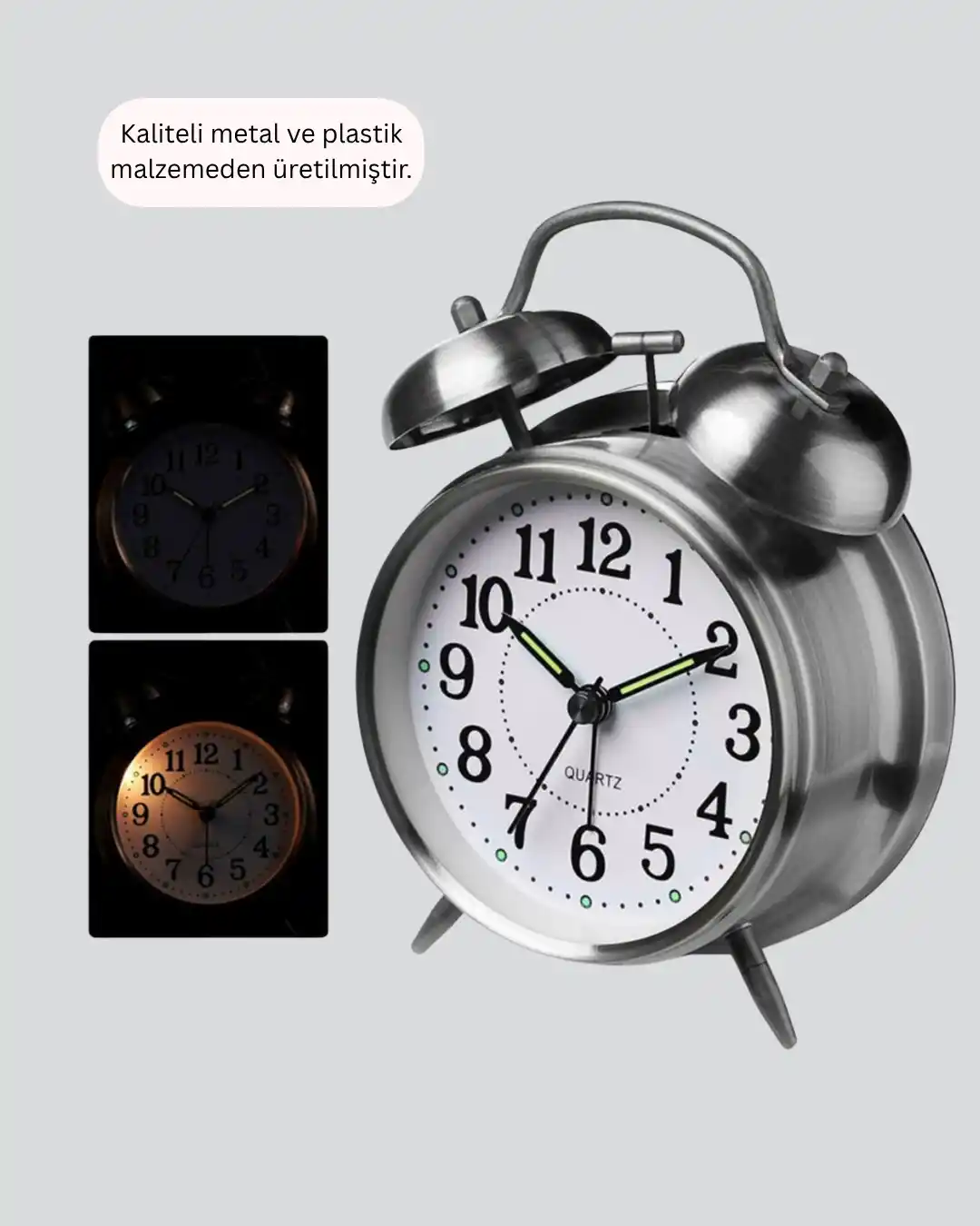 Dekoratif Yuvarlak Gümüş Sessiz Işıklı Masa Üstü Çalar Saat Alarmlı ve Şık Tasarım