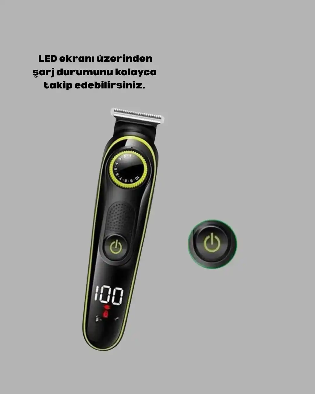 Kablosuz kullanım özgürlüğüyle tasarlanan bu şarjlı tıraş makinesi, pratikliği ve konforu bir araya getirir. Güçlü motoru sessiz çalışır, bu sayede sabah rutinlerinde çevreyi rahatsız etmeden kullanılabilir. Paslanmaz çelik bıçakları keskinliğini uzun süre korur ve cilt dostu yapısıyla tahrişi önler. Tek cihazda 5 farklı işlev sunar: saç kesimi, sakal düzeltme, burun-kulak tüy temizliği, yüz hattı şekillendirme ve vücut bakımı. LED ekranı şarj durumunu net biçimde gösterir. Ergonomik tasarımı sayesinde elde kolayca tutulur ve kaymaz. Suya dayanıklı yapısıyla temizliği son derece kolaydır. Tam şarjla uzun süreli kullanım imkânı sunar. Modern görünümüyle banyonuzda şık bir duruş sergiler.