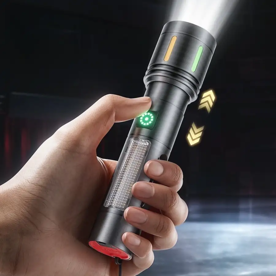 Gold Police GP-212 Şarjlı Metal El Feneri, 1000 lümen ışık gücüyle uzun menzil ve geniş açı aydınlatma sağlar. 5 farklı mod ile (güçlü, kısık, flaşör, beyaz COB, mavi-kırmızı çakar) her ihtiyaca uygundur. ZOOM özelliği sayesinde uzak mesafeleri net şekilde aydınlatır. Type-C şarjlı, su geçirmez ve dayanıklı metal gövdeli tasarımıyla profesyonel kullanım için idealdir.