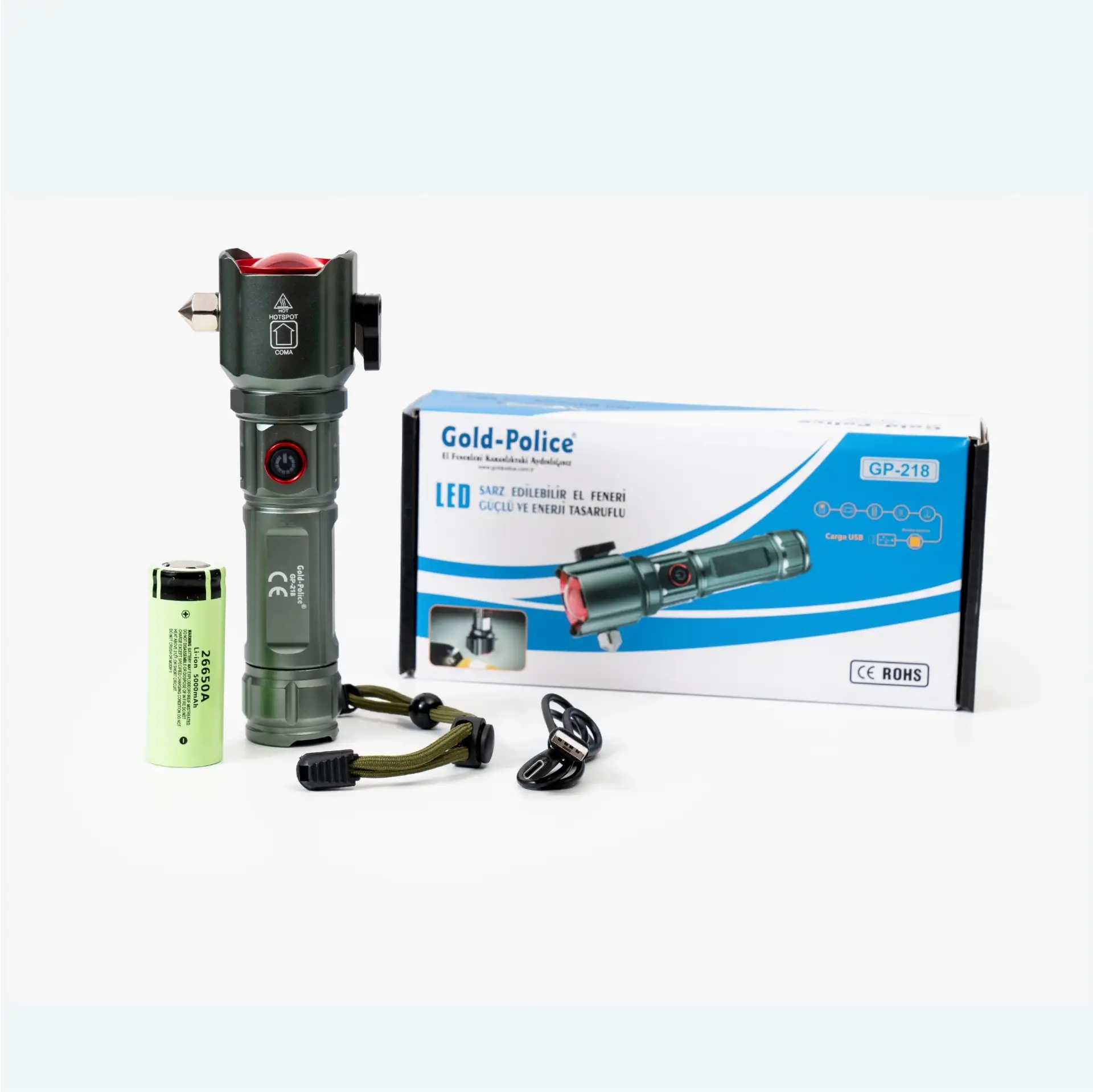 Gold Police GP-218 acil durum el feneri, güvenliğinizi ön planda tutarken güçlü ve uzun menzilli aydınlatma sağlayan kaliteli bir el feneridir. GP-218 el feneri, güvenlik ve aydınlatmanın mükemmel birleşimi olarak, iş güvenliği ortamlarında kullanım için ideal bir seçimdir. GP-218 el feneri, güçlü aydınlatma kapasitesi ve hayati güvenlik özellikleriyle, zorlu çalışma koşullarında güvenilir bir performans sunar.