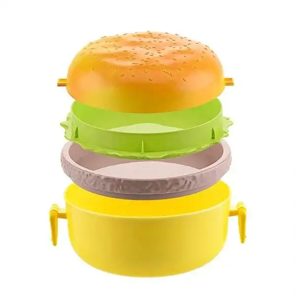 HAMBURGER TASARIMLI BESLENME KABITasarım ve  fonksiyonelliğin bütünleşmiş olduğu bir ürün.İçerisinde bulunan bölme ile yiyeceklerinizi birbirinden ayırabilirsiniz.Yiyeceklerinizin herhangi bir sarsılmada dökülmemesi için kilitleme özelliği vardır. Ürün ÖlçüleriUzunluk: 13.5 cmGenişlik: 9 cmYükseklik: 13.5 cmPaket İçeriği1 adet hamburger tasarımlı beslenme kabı