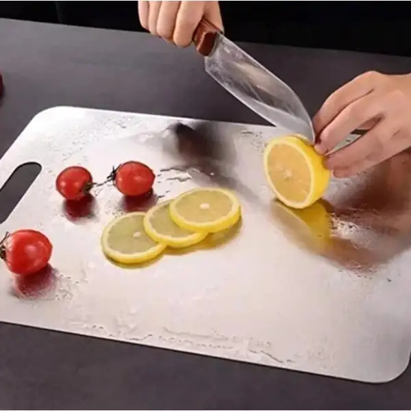 2'Lİ PASLANMAZ ÇELİK KESİM PANOSU SETİÜrün Özellikleri2’li paslanmaz çelik kesim panosu seti, mutfakta hijyenik ve uzun ömürlü kullanım için özel olarak tasarlanmıştır. 18/10 304 kalite paslanmaz çelikten üretilmiş olan bu panolar, gıda için en uygun ve sağlıklı çelikten üretilmiştir, çift taraf skoçlu yüzeyleri sayesinde her iki yüzeyi de kesim için kullanıma uygundur. 0.90 mm kalınlığıyla sağlam ve dayanıklıdır, kolay kolay deformasyon göstermez. Antibakteriyel yapısı sayesinde gıda güvenliğini destekler ve yüzeyi leke tutmaz. Büyük boy 33x23 cm, küçük boy ise 28x20 cm ölçülerindedir. Kırılmaz yapısı ve sağlıklı kullanım özelliği ile mutfakta güvenli bir çözüm sunar. Elde ya da bulaşık makinesinde kolayca yıkanabilir.Paket İçeriği1 adet büyük boy paslanmaz çelik kesim panosu (33x23 cm)1 adet küçük boy paslanmaz çelik kesim panosu (28x20 cm)