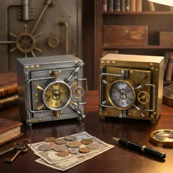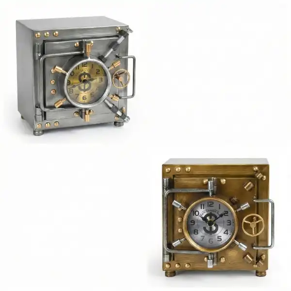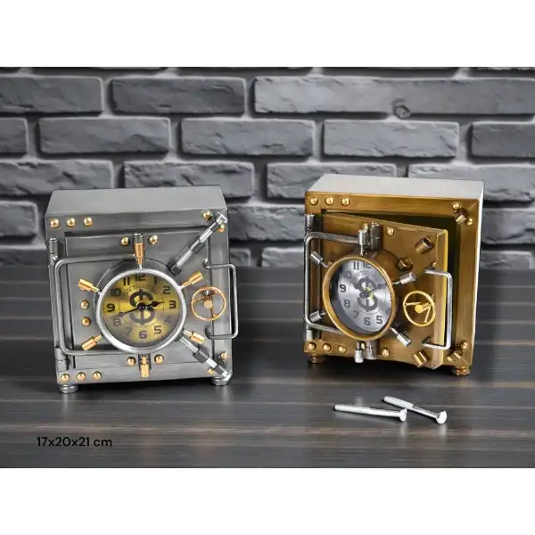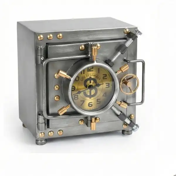 KASA TASARIMLI MASAÜSTÜ SAATÜrün ÖzellikleriKasa tasarımlı masaüstü saat, klasik kasa kapaklarından ilham alan detaylı ve özgün görünümüyle dekoratif saat kategorisinde öne çıkan özel bir modeldir. Metal görünümlü gövdesi, vidalı ve kilitli kasa detayları sayesinde endüstriyel ve retro dekorasyon tarzını başarıyla yansıtır. Saatin ön yüzünde yer alan yuvarlak kadran, net rakam yapısı ile kolay okunabilirlik sunarken mekanik kasa hissi veren tasarımı bulunduğu ortamda dikkat çekici bir dekor unsuru oluşturur. 17x20x21 cm ölçüleri sayesinde masa, raf, kitaplık, ofis masası veya vitrin üzerinde dengeli ve güçlü bir duruş sergiler. Sessiz akan mekanizması sayesinde çalışma, dinlenme ve ofis ortamlarında rahatsızlık oluşturmaz. Dayanıklı yapısı uzun süreli kullanım için uygundur. Renk seçeneği bulunmamaktadır; ürün gümüş veya altın tonlu kasa seçeneklerinden olarak gönderilmektedir. Hem fonksiyonel hem de dekoratif bir masa saati arayanlar için şık ve farklı bir alternatiftir.Paket İçeriği1 adet kasa tasarımlı masaüstü saat