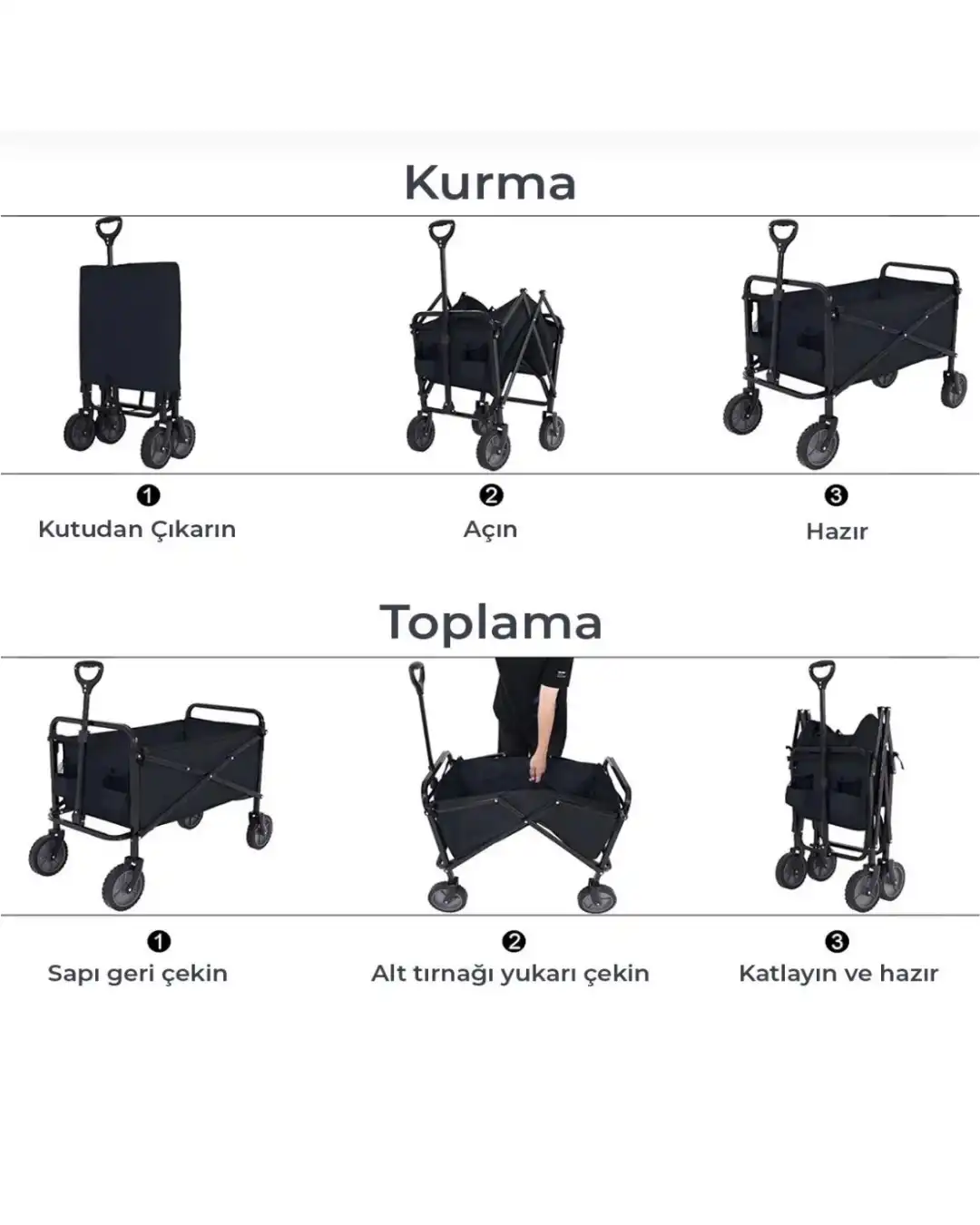 Katlanabilir Kamp ve Plaj Taşıma Arabası, hem açık hava etkinliklerinde hem de günlük yaşamda taşıma kolaylığı sunan fonksiyonel bir vagon modelidir. Kamp alanlarında, plajda, bahçede veya alışveriş sırasında eşyaların tek seferde taşınmasına yardımcı olur.Katlanabilir tasarımı sayesinde kullanım sonrası saniyeler içinde kapatılabilir. Kompakt boyutu sayesinde araç bagajında veya evde kolayca saklanabilir. Montaj gerektirmeyen yapısı, ürünü pratik ve kullanıcı dostu hale getirir.74,8 kg taşıma kapasitesi, ürünü ağır yükler için uygun kılar. Geniş iç hacmi ve ek cepleri sayesinde eşyalar düzenli şekilde taşınabilir. 360° dönebilen ön tekerlekler, manevra kabiliyetini artırır ve farklı zeminlerde rahat kullanım sağlar.Ayarlanabilir kulp sistemi, konforlu bir tutuş sunar. Kilitlenebilir yapısı güvenli kullanım sağlar. Sağlam çelik iskeleti ve dayanıklı kumaşı, ürünü uzun ömürlü hale getirir.Katlanabilir Kamp ve Plaj Taşıma Arabası, pratikliği, dayanıklılığı ve çok yönlü kullanım imkânı ile taşıma ihtiyaçları için güvenilir bir tercihtir.