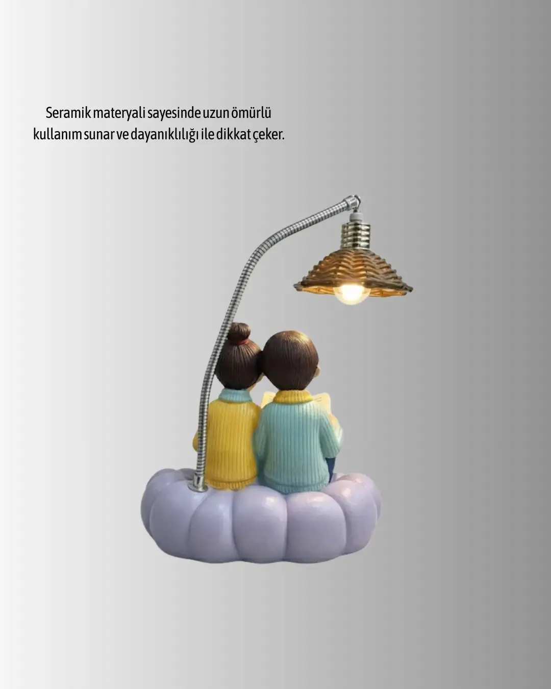 Kitap Okuyan Çift Figürlü Gece Lambası, romantik detayları ve sıcak aydınlatmasıyla ev dekorasyonuna anlam katan özel bir tasarımdır. Yan yana oturmuş, birlikte kitap okuyan çift figürü; sevgi, huzur ve paylaşımın en zarif yansımasıdır. Ürünün esnek metal başlığına bağlı LED ışık, figürün üzerine yumuşak bir şekilde ışık vererek hoş bir ambiyans oluşturur.Bu dekoratif gece lambası, sadece bir aydınlatma ürünü değil aynı zamanda es bir dekor objesidir. Komodin, masa, raf ve kitaplık üzerinde rahatlıkla kullanılabilir. Loş ve sıcak ışık yapısı sayesinde gece lambası olarak ideal kullanım sunar. Göz yormayan LED ışığı, uyku öncesi ortamlar için uygundur.Kaliteli reçine malzemeden üretilmiş figür, sağlam yapısı sayesinde uzun süre formunu korur. Detaylı figür tasarımı, ürüne sevimli ve sıcak bir karakter kazandırır. Hem genç odalarında hem de yetişkin yaşam alanlarında rahatlıkla tercih edilebilir.Sevgililer Günü, evlilik yıldönümü, doğum günü veya yeni ev hediyesi olarak duygusal ve anlamlı bir seçimdir. Romantik tasarımıyla bulunduğu ortama sıcaklık katar ve özel anları simgeler. Günlük yaşamda dekoratif bir dokunuş arayanlar için hem şık hem işlevsel bir üründür.