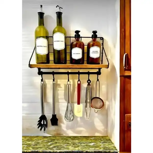 METAL ASKILIKLI KAHVE KÖŞESİ RAFIÜrün ÖzellikleriMetal askılıklı kahve köşesi rafı, mutfağınızda düzeni ve şıklığı bir arada sunar. Üst kısmı ahşap raf, alt kısmı ise metal boru üzerine yerleştirilmiş 6 adet sağlam askılıktan oluşur. Duvara monte edilebilen bu dekoratif düzenleyici, kahve fincanlarınızı, küçük tabakları, kavanozları ve mutfak aksesuarlarını estetik bir biçimde sergilemenize olanak tanır. Mutfak tezgâh üstü alanlarda veya kahve köşelerinde fonksiyonel ve modern bir görünüm yaratır. Metal iskeleti sayesinde uzun ömürlü kullanım sağlar. Az yer kaplayan tasarımı ile dar alanlarda bile pratik çözümler sunar.Ürün ölçüleri; uzunluk 42 cm, genişlik 13 cm, yükseklik 20 cm'dir. Paket İçeriği1 Adet Metal Askılıklı Kahve Köşesi Rafı