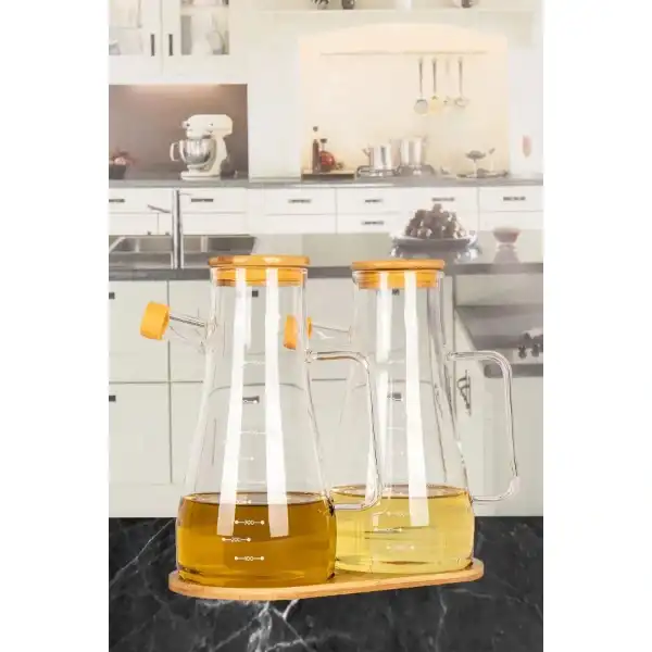 STANDLI 2'Lİ CAM YAĞDANLIKÜrün ÖzellikleriStandlı 2'li Cam Yağdanlık, şık ve fonksiyonel tasarımı ile mutfaklarınıza zarif bir dokunuş katar. Borosilikat cam malzeme ile üretilmiştir ve 900 ml kapasiteye sahiptir. Silikon uçları sayesinde sızdırmazlık sağlar ve kullanım sırasında kolayca kontrol edilebilir. 2 adet olarak sunulan bu set, yemeklerinizde ya da salatalarınızda doğru miktarda yağ dökmenizi sağlar. Ahşap kapakları ise estetik ve doğallığı bir araya getirir. Ayrıca, her iki yağdanlık da üzerinde ölçü birimleri ile işaretlenmiştir, böylece ihtiyacınız olan miktarı daha rahat ayarlayabilirsiniz.Paket İçeriği1 Adet Standlı 2'li Cam Yağdanlık