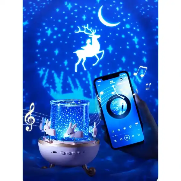 TAVŞAN ATLIKARINCA MULTİFONKSİYON PROJEKTÖRÜrün ÖzellikleriTavşan Atlıkarınca Multifonksiyon Projektör, müzik kutusu olarak da çalışabilen ve mobil cihazlar ile Bluetooth üzerinden müzik çalabilen bir üründür. Üst kısmındaki ve içteki tavşan figürleri döner, geceyi daha eğlenceli hale getirir. Cihaz, farklı ışık seviyeleri sunarak loş, orta ve güçlü aydınlatma seçenekleriyle ortamın aydınlatmasını değiştirir. Sıcak ışık, nötr ışık ve renkli ışık seçenekleriyle atmosferin tarzını değiştirebilirsiniz. Gökyüzü desenleri ve sevimli desenler içeren 12 farklı projeksiyon film diski sayesinde duvar ve tavana yıldızlar veya çeşitli desenler yansıtılabilir. USB ile şarj edilebilen bu projektör, bebek/çocuk odalarında kullanılabileceği gibi, gece lambası, uyku yardımcısı ya da hediye olarak da tercih edilebilir.Paket İçeriği1 Adet Tavşan Atlıkarınca Multifonksiyon Projektör