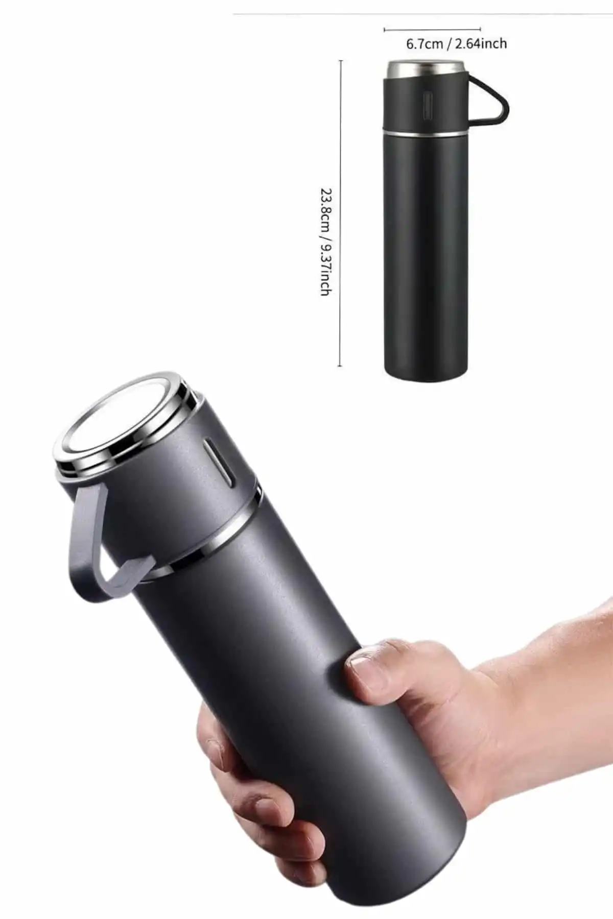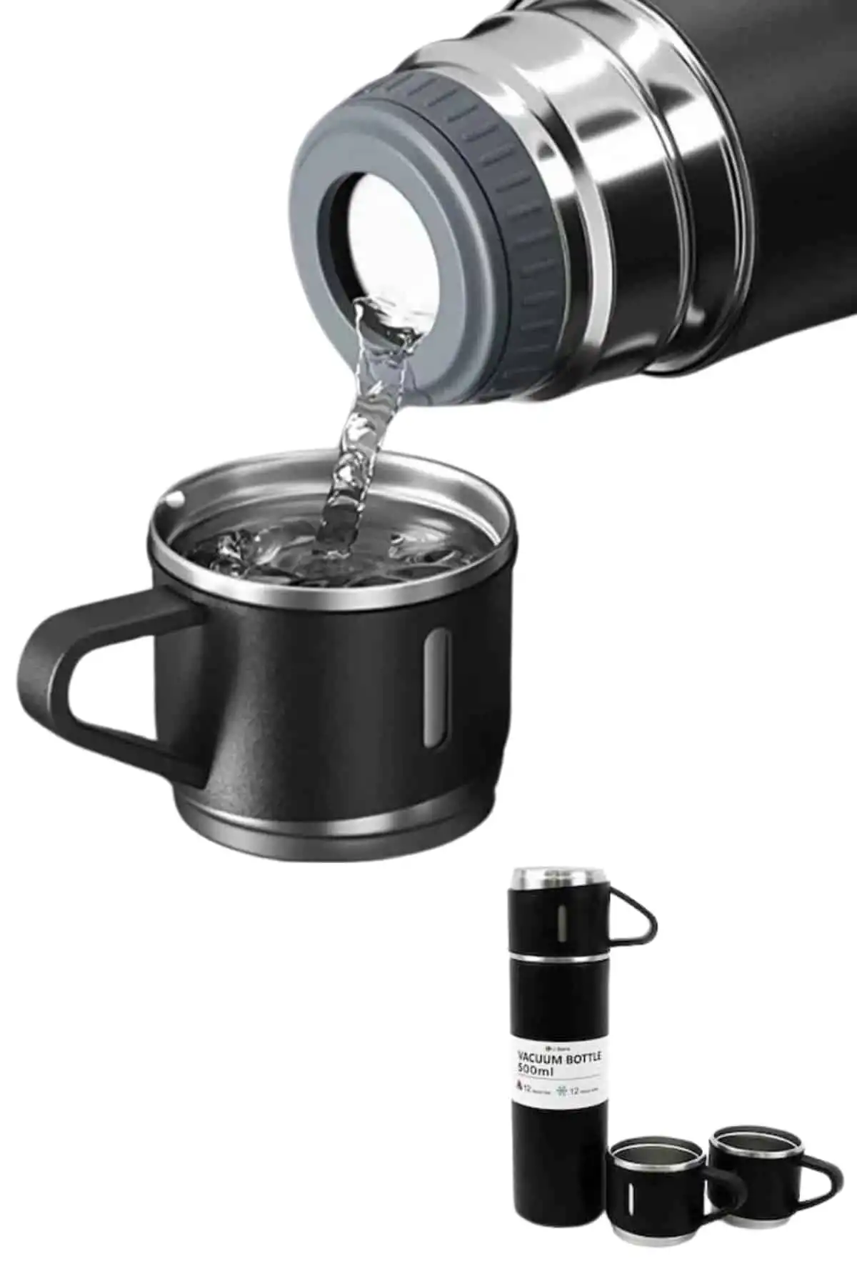 • Termos Paslanmaz Çelik Termos Siyah Renk 3 Bardaklı Termos Seti