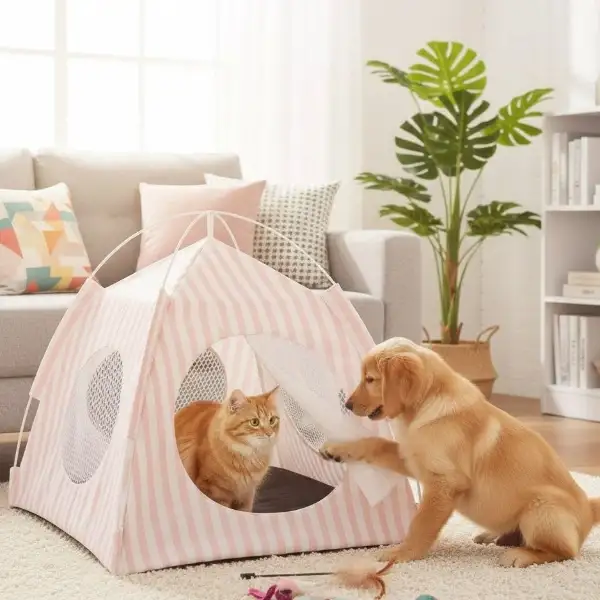 EVCİL HAYVAN KATLANABİLİR OYUN ÇADIRIÜrün ÖzellikleriEvcil Hayvan Katlanabilir Oyun Çadırı, kediler ve küçük ırk köpekler için güvenli ve eğlenceli bir yaşam alanı sunar. 41x41 cm taban ölçüsü ve 43 cm yüksekliği ile evcil hayvanların rahatça içine girip uzanabileceği bir alan oluşturur. Hafif ve katlanabilir yapısı sayesinde hem ev içinde hem de dış mekânda kolayca kullanılabilir. Nefes alabilir file pencereleri hava sirkülasyonunu artırırken, ön kısmındaki perde detaylı giriş kapısı hayvanların özgürce girip çıkmasını sağlar. Dayanıklı kumaşı uzun süreli kullanım sağlar ve pratik kurulumu ile her ortamda hızlıca hazırlanabilir. Renk seçimi yapılamaz; görselde yer alan renklerden biri olarak gönderilir.Paket İçeriği1 adet Katlanabilir Evcil Hayvan Oyun Çadırı