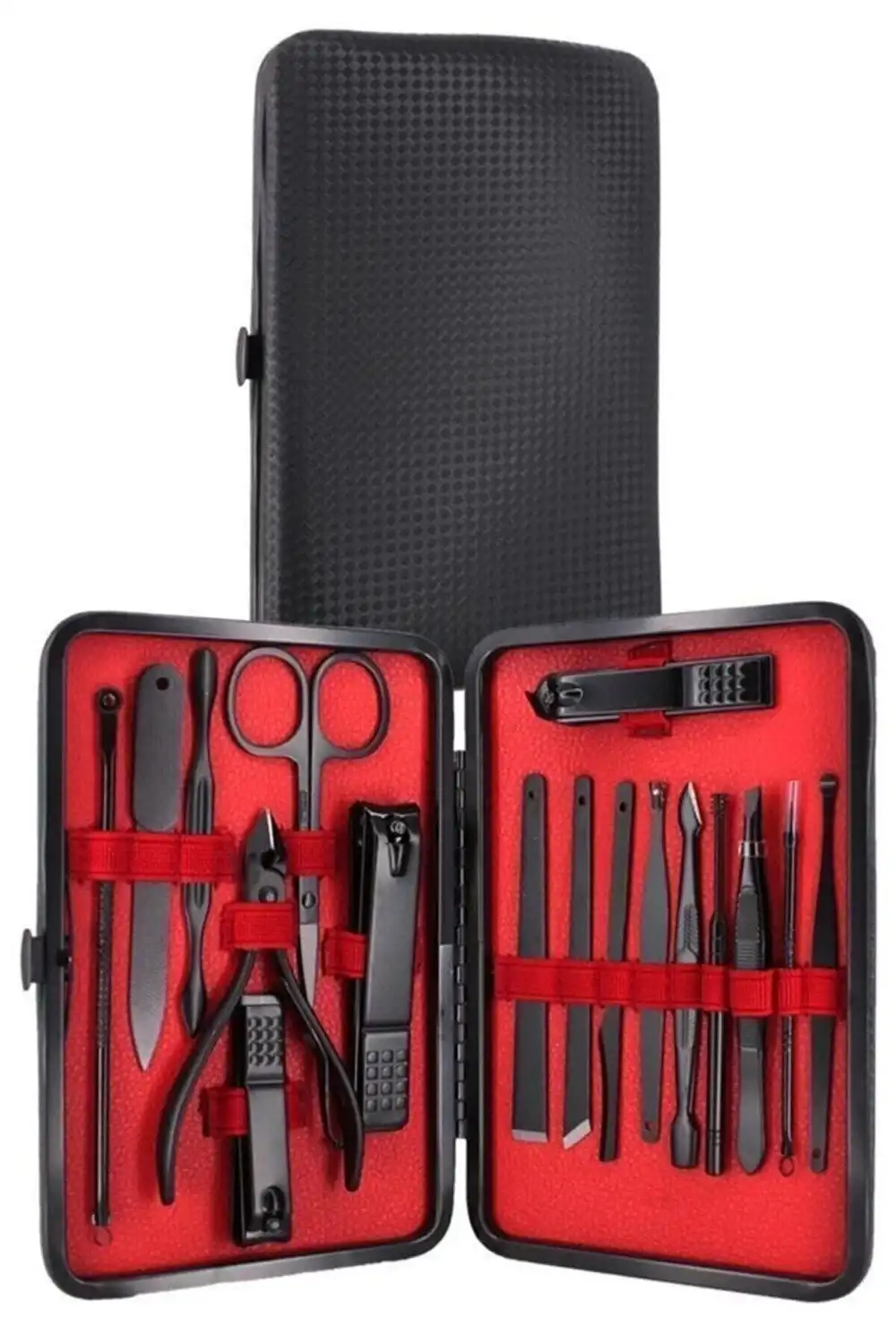 1 büyük tırnak makası1 küçük tırnak makası1 sivri uç tırnak makası ( Tırnaklara şekil vermek için )1 çift uçlu komedon1 törpü1 et ittirici1 çift taraflı tırnak kaldırma aleti1 makas1 pedikür bıçağı ( ayak tabanları için )1 çarpraz pedikür bıçağı ( ayak tabakları için )1 kavisli pedikür bıçağı ( ayak tabanları için )1 V şeklinde et itme ( Tırnak çevresinde ki ölü deriyi temizleme )1 itme çubuğu ( Tırnak içinde ki ve çevresinde ki kirleri temizler )1 tırnak temizleme 1 cımbız1 iğneli komedon1 kulak temizleme