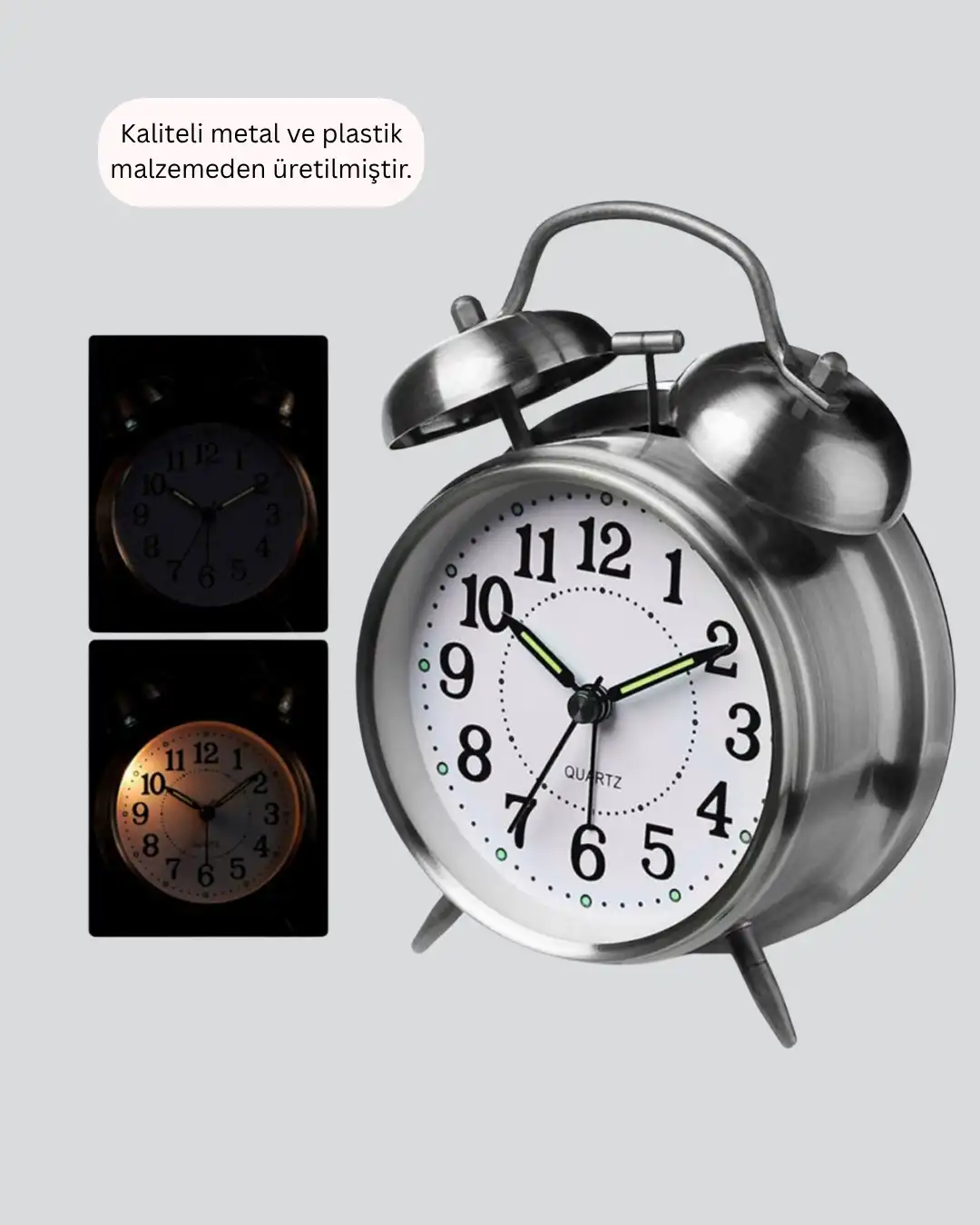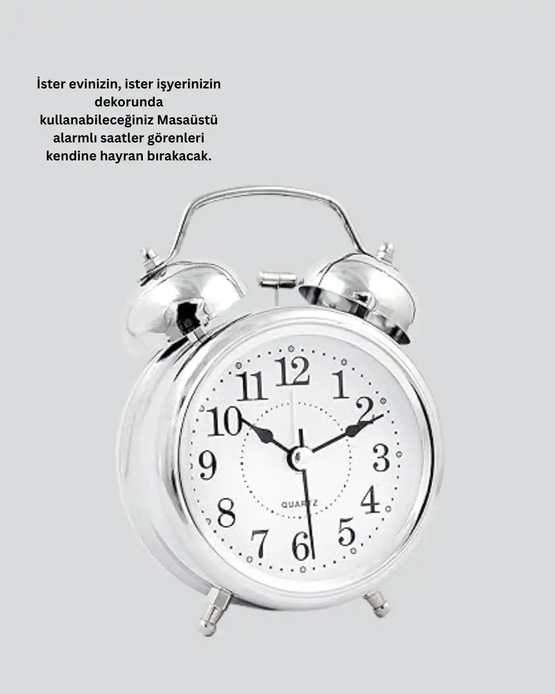Zamana şıklık katmak hiç bu kadar kolay olmamıştı! Dekoratif Yuvarlak Gümüş Işıklı Masa Üstü Saat, hem modern hem klasik çizgileriyle her yaşam alanına uyum sağlar. Yüksek kaliteli metal ve plastik malzeme kombinasyonu, ürüne dayanıklılık kazandırırken, parlak gümüş rengi dekoratif olarak göz alıcı bir görünüm sunar.Bu masa saati, yalnızca dekoratif bir obje değil, aynı zamanda güçlü alarm fonksiyonuna sahip işlevsel bir ürün olarak öne çıkar. Alarm sesi, ağır uykulu kullanıcıları bile kolayca uyandıracak güçtedir. Sabahları geç kalma derdine son verir! Ayrıca sessiz çalışan mekanizması, rahatsız edici tik-tak seslerini ortadan kaldırarak huzurlu bir uyku veya çalışma ortamı oluşturur.Işıklı ekran özelliği, karanlık ortamlarda bile saati net bir şekilde görmenizi sağlar. Gece başucunuzda hem zarif bir aksesuar hem de kullanışlı bir ışık kaynağı olarak görev yapar. Kompakt ölçüleri (12 x 9 x 5 cm) sayesinde fazla yer kaplamaz; komodin, masa veya raf üzerinde mükemmel bir duruş sergiler.1 adet AA pil ile çalışır (pil dahil değildir) ve enerji tasarrufu sağlayan yapısıyla uzun süreli kullanım sunar.İster evinizde, ister ofisinizde kullanın; bu saat bulunduğu ortama zarif bir hava katar.Ayrıca şık kutulu ambalajı sayesinde hediyelik olarak da ideal bir tercihtir. Yeni ev hediyesi, doğum günü ya da özel günlerde sevdiklerinize es ve kullanışlı bir sürpriz yapmak için mükemmel bir seçimdir.Görünümüyle dikkat çeken bu masa saati, zamana stil katan herkesin favorisi olacak!