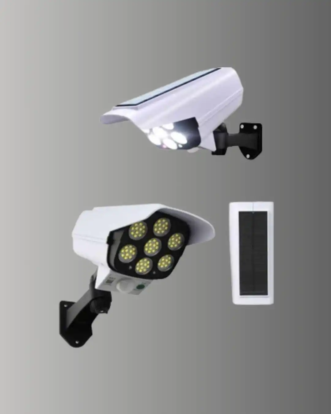 Bu akıllı güneş ışığı, hem çevresel güvenlik sağlayan LED aydınlatma hem de  kamera görünümü ile etkili bir caydırıcılık sunar. LED ışık kaynağı olarak kullanılan 77 adet SMD boncuğu, yüksek parlaklıkta aydınlatma sağlar. Cihazın üst kısmında bulunan polisilikon güneş paneli gün içinde bataryayı şarj eder.Dahili 2400mAh kapasitesindeki pil ile 8–10 saat boyunca sürekli kullanım sağlanabilir. Işık modları: Sadece kırmızı ışık yanar, hareketle beyaz ışık devreye girer. Sürekli düşük ışık + hareketle güçlü ışık. Sürekli açık mod + yanıp sönen kırmızı ışık.PIR sensör ile 5-8 metre mesafedeki hareketleri 120° açıyla algılar ve otomatik tepki verir. Ürün PVC + PC'den üretilmiştir, IP65 su geçirmez özelliktedir. Montajı oldukça kolay olup, balkon, bahçe, araba yolu gibi birçok alanda rahatlıkla kullanılabilir.