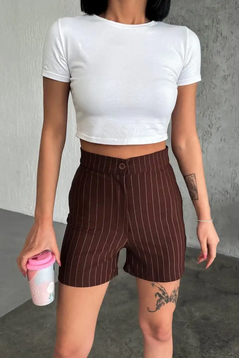 Zarif ve Şıklığı Bir Arada Sunan Yüksek Bel Krep Esnek Çimalı Çizgili Şort Kahverengi