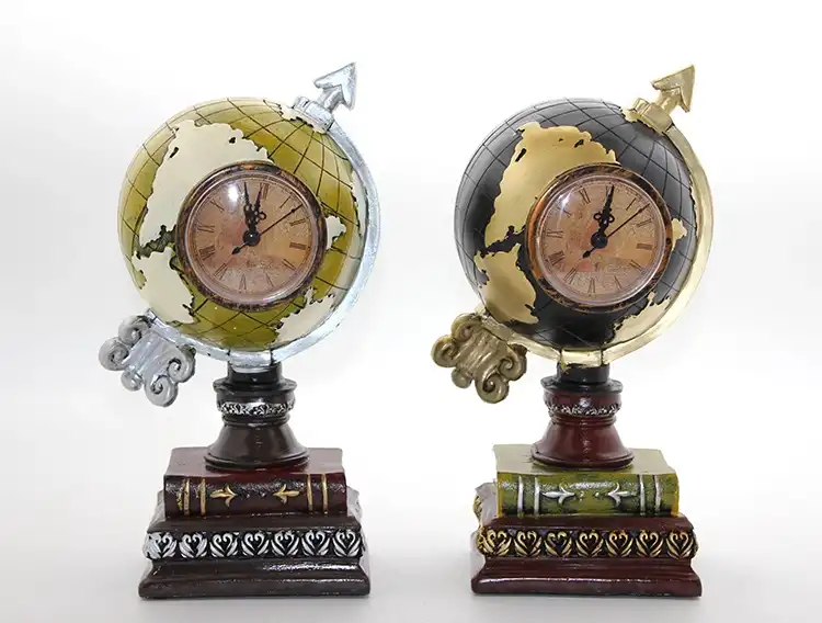 POLYESTER SAATLİ DÜNYA KÜREÜrün ÖzellikleriPolyester Saatli Dünya Küre, klasik dünya küresi tasarımını masa saati fonksiyonuyla birleştiren dekoratif ve işlevsel bir masaüstü aksesuarıdır. Antik eskitme görünümlü detayları, işlemeli kaide yapısı ve üst kısmındaki küre formu ile bulunduğu ortama nostaljik ve prestijli bir hava katar. Ön yüzeyde yer alan analog saat mekanizması sayesinde hem zamanı takip edebilir hem de dekoratif bir obje olarak kullanabilirsiniz. Polyester malzemeden üretilmiş sağlam gövdesi, detaylı işçilik görünümü sunar ve masa üzerinde dengeli bir duruş sağlar. Ofis masalarında, çalışma alanlarında, kitaplık raflarında ve klasik dekorasyon tarzına sahip mekanlarda dikkat çekici bir tamamlayıcıdır. Hem dekoratif hem fonksiyonel yapısıyla öne çıkan bir saatli masaüstü dünya küresi seçeneğidir. Klasik tasarım sevenler için şık bir dekoratif polyester dünya küre saat alternatifidir. Görselde yer alan iki modelden biri olarak gönderilmektedir.Ürün Teknik ÖzellikleriÖzellikAçıklamaÜrün AdıPolyester Saatli Dünya KüreMalzemePolyesterTasarımAntik Eskitme Görünümlü Küre ve SaatFonksiyonAnalog Saat + Dekoratif KüreModel2 Farklı Model ( Gönderim)Kullanım AlanıEv, Ofis, Çalışma Masası, KitaplıkPaket İçeriği1 Adet Polyester Saatli Dünya Küre