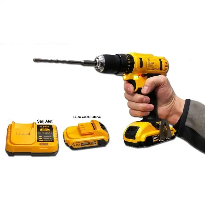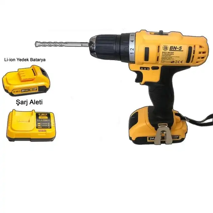 Çift Akülü Matkap Vidalama Seti Banco BN-5Yedek aküsü ile uzun süre kullanabileceğiniz Li-ion bataryalı Banco Şarjlı Vidalama seti ile tamir işleriniz çok daha kolay.24V 5 Ah Çift Akülü Matkap Vidalama Seti ÖzellikleriSürekli kullanılmaya uygun olarak üretilmiştir2 Kademeli Manuel hız özelliğine sahiptirDevir Ayar özelliğine sahiptirSağ ve sol dönüş özelliğine sahiptirAnahtarsız ( otomatik ) mandrenlidir18 Hız ayarlı tork özelliğine sahiptirElektrik fren sistemine sahiptir. Akülü Matkap İçerisinde Bulunanlar1 Adet Alman Vidalama Makinası2 adet 5 Amper Batarya1 Adet Şarj Cihazı1 Adet tekli yıldız vidalama ucuÖzel Taşıma çantası Teknik ÖzelliklerKapasite: Çelik: 20mm – Ahşap: 36mmBoşta devir: 0-350/1.350 d/dkMaksimum tork: 14/24 N.mNet ağırlık: 1.7 kgGüç kapasite: 24V/2 x 4Ah/Li-ionMandren: 1/2′